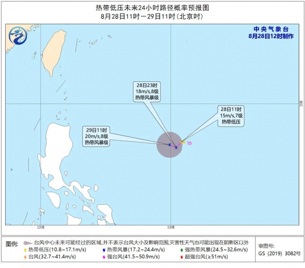 热带低压生成信息:菲律宾以东洋面的热带扰动已于今天08 时加强为热带低压,中心位于菲律宾马尼拉偏东方约1110公里的洋面上(北纬17.2度、 东经131.0度),中心附近最大风速 15 米/秒(7 级,热带低压级)。预计该热带低压原地回旋,未来24小时内将发展为今年第9号台风,然后向西北偏北方向移动。31日~9月1日穿过我省外海渔场,受其影响,钓鱼岛海域、闽外渔场和闽东渔场东部最大风力可达10~12级阵风13~15级;我们也将继续关注其发展和动态。