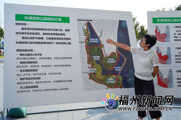 福州市规划设计研究院园林景观副所长马奕芳介绍东湖湿地公园规划。 其中,在湿地公园内将打造海丝主题活力艺术区、湿地科普教育区、生态湿地观赏区、防护林生态体验区、水上观光游憩区等功能区。 据了解,东湖湿地公园项目分三期建设,一期已基本完成。一期为东湖湿地启动区生态修复工程,以地形地貌治理和乔木种植为主,投资约1亿元。此外,公园二期也将于年内推进建设。 “黄金海岸线”打通交通网络 228国道滨海新城段与东湖湿地公园遥相呼应,道路周边灌木丛高低错落有致,风景美不胜收,228国道滨海新城段也被誉为“黄金海岸线”。