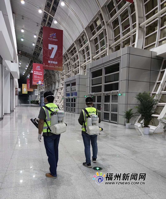 在疫情防控常态化大背景下,消毒工作成为防疫的重要环节。连日来的深夜,海峡国际会展中心总能看到一群穿着反光背心,佩戴口罩、手套,背着喷雾器的消毒员,行走在会展中心展厅、会议区、测温帐篷等公共区域,为第三届数字中国建设峰会防疫工作筑起一道坚实防线。