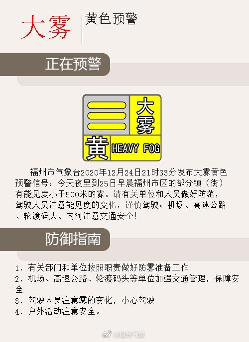 【福州市大雾黄色预警信号】福州市气象台12月24日21时33分发布大雾黄色预警信号:今天夜里到25日早晨福州市区的部分镇(街)有能见度小于500米的雾。请有关单位和人员做好防范,驾驶人员注意能见度的变化,谨慎驾驶;机场、高速公路、轮渡码头、内河注意交通安全!