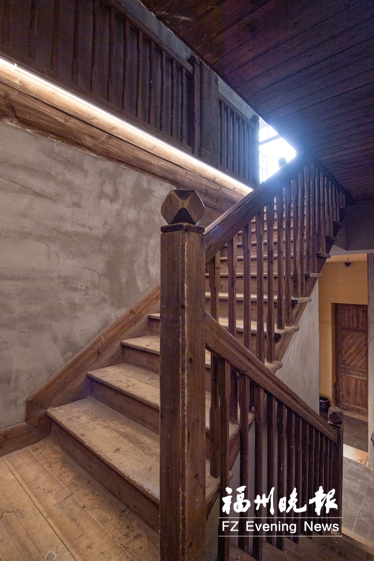 建筑内部为中西结合风格。 经过一年多的业态引入和内部装修,今年春节,中平路102号这座福州市风貌建筑终于对外开放。门头房引进了益民眼镜,天井两侧的厢房开辟成为咖啡厅,夜幕降临之后,主座成为都市白领下班后小憩的特色酒吧。古厝蝶变,成了福州潮人们的新晋打卡点。值得一提的是,益民眼镜一侧的墙面用透明玻璃罩住,保留了一面原来古厝的墙体,向市民和游客展示102号的过往岁月。