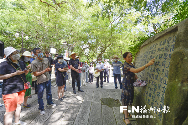 嘉宾参访乌山摩崖石刻。记者 池远 摄 福州日报记者 吴晖 “福州有‘三山现,三山藏,三山看不见’之说,‘三山现’指的是乌山、于山与屏山,大家现在所在的乌山是福州‘三山’之首,位于福州市中心,是福州‘三山两塔一条街’古城空间格局的重要组成部分,也是福州城市山体景观系统中的标志性节点。”21日上午,来榕参加第44届世界遗产大会的嘉宾来到乌山参访,嘉宾一行下车行至乌山脚下,讲解员寥寥数语便道出了乌山之胜,引得与会嘉宾一片赞叹声。 嘉宾拾级而上,一路前行。“我发现乌山怪石嶙峋、林壑幽胜,与昆明石林有异曲同工之妙。来到这里,感觉既新鲜又亲切。”来自石林风景名胜区管理局的高红侠兴致勃勃地告诉记者。 乌山现存从唐代至近代的169段摩崖石刻。参访中,这些石刻让桂林漓江风景名胜区管委会的齐俊目不暇接。他告诉记者:“来到这里,宛若走入了一座露天书法石刻博物馆,不仅篆书、隶书、楷书、草书、行书兼备,而且石刻出自李纲、朱熹、曾巩等历史名人之手,乌山历史文化底蕴积淀太深厚了。以后有机会来福州,我一定还要再来乌山。” “大家登山是不是有点累了,大家到前面的先薯亭休息下,我再和大家讲讲相关的故事。”与会嘉宾来到先薯亭后,没有急着坐下休息,而是细细打量这座八角、重檐歇山顶的亭子。“大家都吃过番薯吧?这座亭子便与一位叫陈振龙的福州人有关。”讲解员的开场白引发了大家的兴趣,大家纷纷表示愿闻其详。原来先薯亭是为纪念最早引种及推广番薯种植的归国华侨陈振龙和福建巡抚金学曾而建。讲解员向嘉宾介绍,明万历年间,福州大旱,百姓陷入饥荒之中。在菲律宾经商的福州华侨陈振龙见到当地的红薯易于种植可充当粮食,便冒险将在菲律宾被视为“国宝”的红薯育苗藏在毛竹筒和篮子中带回了福州,试种成功后报告当时的福建巡抚金学曾。金学曾教导百姓种植,从而拯救了饥荒中的灾民,进而推广到全国。 来自贵州省荔波世界自然遗产管理局的莫如铁听罢先薯亭的故事后,感触颇多,他告诉记者:“这体现了福州人的感恩之情。”他同时表示,福州很重视各景点景区历史人文底蕴的挖掘,以文促旅,注重文旅融合很值得其他地方学习。 |