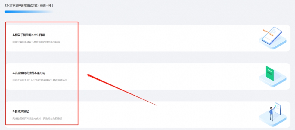 二、进行预登记可以选择以下方式: (1)可通过受种者“预留手机号+出生日期”; (2) 预登记方式:儿童编码或接种本条形码; (3)可通过“自助建档”方式进行信息的填写。