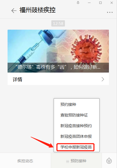 屏东中学、福州三中临时接种点也可预约接种。 监护人手机端在接种前通过三种方式预登记,流程如下: 一、关注:福州鼓楼疾控公众号,进入“预防接种”-“学校申报新冠疫苗”模块。