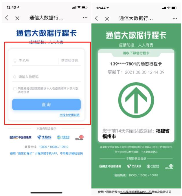 2、进入“通信大数据行程卡”服务页面后填写本人手机号并输入验证码(需勾选“同意并授权运营商查询本人在疫情期间14天内到访地信息”),点击查询即可获得“通信大数据行程卡”。