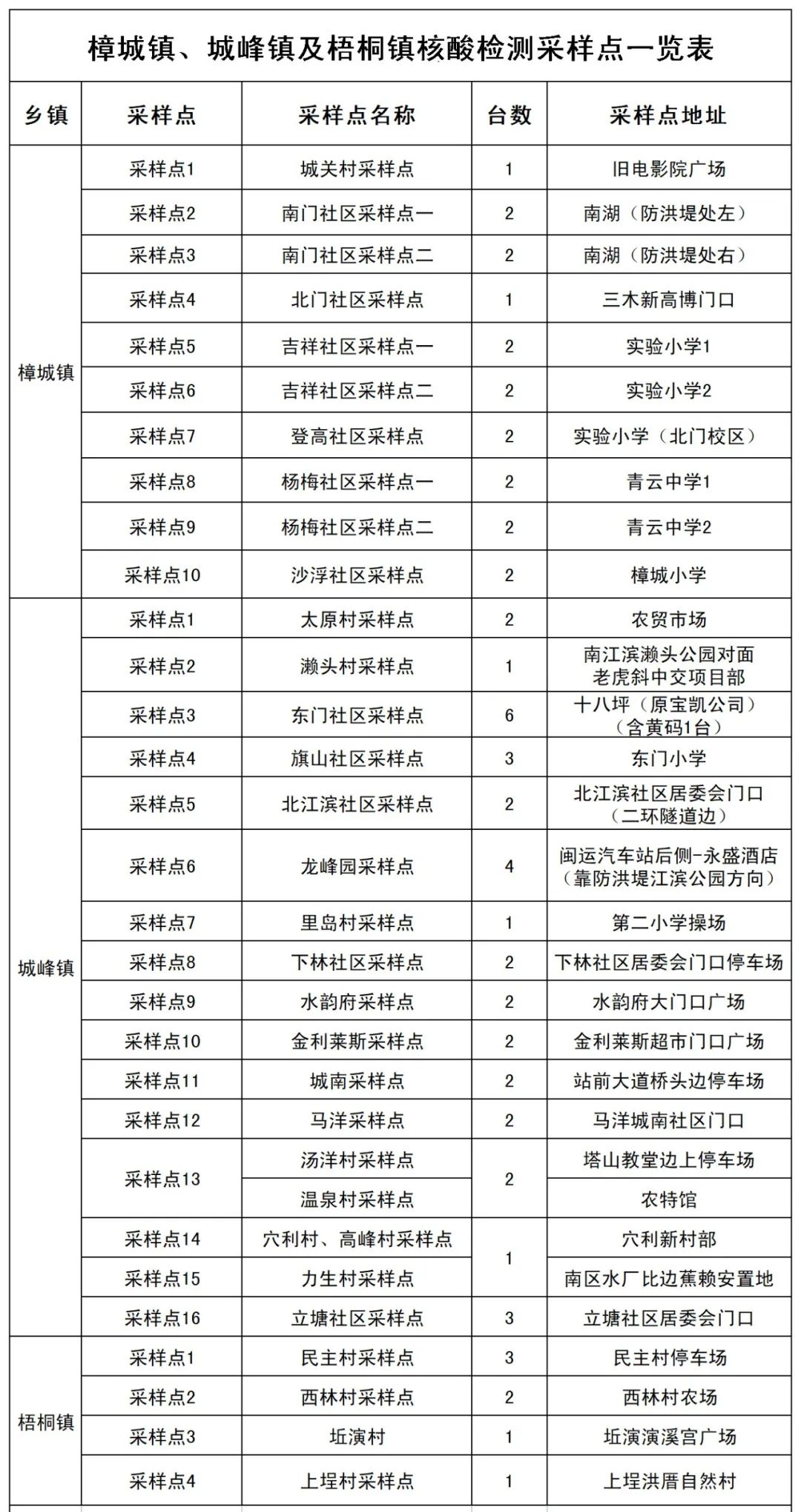2022-03-24 08:38:01 来源:永泰县新型冠状病毒感染 肺炎防控工作指挥部 责任编辑:蔡秀明 作者:永泰县新冠肺炎防控工作指挥部关于开展部分乡镇核酸检测的通告 〔2022〕5号 针对当前疫情防控形势,为保障人民群众身体健康和生命安全,永泰县新冠肺炎防控工作指挥部决定开展部分乡镇核酸检测。现将有关事项通告如下: 一、检测时间 2022年3月24日12:00-22:00。 二、参加检测人员 樟城镇、城峰镇及梧桐镇内工作、生活的所有人员(包括常住人口、暂住人口、临时流动人口、外籍人口等)。 老弱病残孕等行动不便的特殊人员,请提前向村(社区)报备,由乡镇组织流动采样队上门服务。 三、不参加检测人员 1.3月24日12:00之前48小时内,已经接受核酸检测或接种过疫苗的人员; 2.健康码为红码、黄码人员(黄码人员可以直接前往农特馆核酸检测点进行检测),居家隔离和集中隔离点人员; 3.在校师生(含幼儿园)另行安排核酸检测,由县教育局统一安排检测时段和地点。 四、检测地点 请按照所在村(社区)、企业通知的具体时间段,错峰前往就近采样点进行核酸检测。具体详见相关乡镇核酸检测采样点一览表(附后)。 五、注意事项 1.检测现场需拉警戒线、实施人员管控、开展环境消杀等,请广大市民朋友按照现场工作人员的引导有序参与。 2.为提高检测效率,请广大市民朋友务必在检测前提前下载登录“e福州”APP,注册申领全员核酸检测预登记码。 3.参加检测时,请携带本人身份证、“e福州”全员核酸预登记码,全程佩戴好口罩,按村(社区)通知的具体时段有序前往指定采样点进行检测。 4.检测过程中,请广大市民朋友服从现场工作人员的安排和指挥,做好个人防护,保持1米以上距离(采样时方可取下口罩),避免相互聚集和交谈;不要触碰采样人员防护服、检测台和检测台上的物品。检测结束后,要立即戴好口罩,并尽快离开现场。 5.检测期间,请无关人员不要围观;请广大市民朋友关注官方渠道发布的疫情防控信息,不造谣、不信谣、不传谣。对散播谣言者将依法追究法律责任。 6.对拒不配合、不执行本通告,干扰、阻挠疫情防控工作,瞒报、谎报、伪造信息的,将依法追究法律责任。 7.上述乡镇要有序安排参检人员分时段错峰采样。 8.上述乡镇要预先发动参检人员准备采样码,截屏或打印采样码。 9.此次检测,不收取检测费用。 特此通告。 永泰县新型冠状病毒感染 肺炎防控工作指挥部 2022年3月24日
