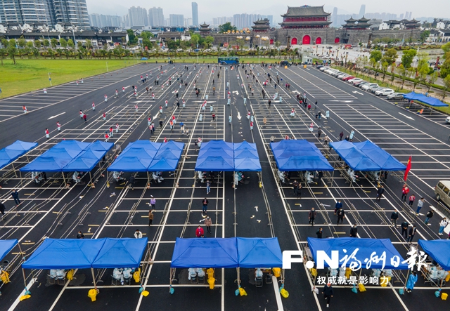 闽越水镇前,市民群众有序排队采样。记者 石美祥 摄 现场直击: 有序高效,群众点赞 核酸检测现场,就是疫情防控“战场”。记者在多个核酸检测采样点看到,“大白”操作规范、动作娴熟,工作人员、志愿者和公安民警各司其职、争分夺秒,市民群众主动配合、有序排队,为阻断疫情传播撑起有力的“保护伞”。 上午7时许,市民刘大姐就按照通知的时间,来到仓山区少年宫核酸检测采样点。“不到10分钟就完成采样,真快!”刘大姐竖起大拇指点赞。记者看到,该采样点的3个通道同时开启,市民群众戴好口罩有序排队采样。采样结束后,大家立即离场,不在现场逗留。 8时,在鼓楼区安泰街道乌山社区,市民群众分批被引导到等候区排队,从登记信息到完成采集,全过程不到2分钟。“我们采用分时段检测的方式,减少人员排队,提高检测效率。”乌山社区党委书记黄斌说。 9时,85岁的林爱珠带上当天“时段2”的蓝色纸条,来到台江区宁化街道长汀社区万科金域中央的核酸检测采样点,在志愿者引导下,通过绿色通道,不到3分钟就完成了采样。 “亲测,很快!”“一切井然有序,基层组织好强大!”“给社区点赞!”……无论是在核酸检测采样点现场,还是在市民的微信朋友圈,有序、快速、高效成了大家提到的高频词。 上午9时许,在仓山区少年宫核酸检测采样点,第一批60个采样管1200人次的拭子样本被收走;中午12时45分,闽侯县竹岐乡中埕停车场采样点已经完成6800多人的采样,在预定的时间多做了近1000人;下午3时50分,长乐区航城街道会展中心广场核酸检测采样点,人流已散,只留下一个通道为零星前来的居民做采样,其他通道的医务人员正在清理现场…… 截止到19时,六个区县全面完成核酸检测采样。 不仅是采样高效,核酸检测报告也出得很快。27日下午起,市民陆续收到上午做的核酸检测报告。 背后探访: 广泛宣传,提前布置 此次疫情,病毒传播速度快,凸显核酸检测的重要性,而这场与病毒的“赛跑”,不仅得益于市民的配合,亦得益于广泛宣传发动、打好提前量。 广泛宣传发动,是做好新一轮区域核酸检测的第一步。在鼓楼区南街街道杨桥河南社区,社区干部连夜张贴海报,科学布点,发动党员、楼栋长、网格员等力量,有序带领居民群众前往就近的采样点。“我们通过短信、微信及时告知群众采样的时间、地点、注意事项、预登记方式等,简单易懂。”社区党委书记陈丽说。 提前布置采样点,是保证核酸检测顺利进行的前提。在乌山社区,社区干部通宵奋战,摆放桌椅,消杀场地,拉起警戒带,布置一米线。在长乐区首占镇长乐人民公园核酸检测采样点,首占镇紧急调配物资,在公园前的广场连夜冒雨搭建起约400米的帐篷长廊,每个帐篷支架下方还绑着加固沙袋。 人员匹配到位,采样才能提速。清晨5点,天还没亮,一辆辆大巴、公交车载着“大白”从各家医疗机构出发,支援各个核酸采样点。为全力支持新一轮区域核酸检测,市一医院、市二医院、孟超肝胆医院、福州儿童医院、市中医院、市妇幼保健院、马尾区医院等医疗机构出动一批批“大白”,不断充实采样力量。