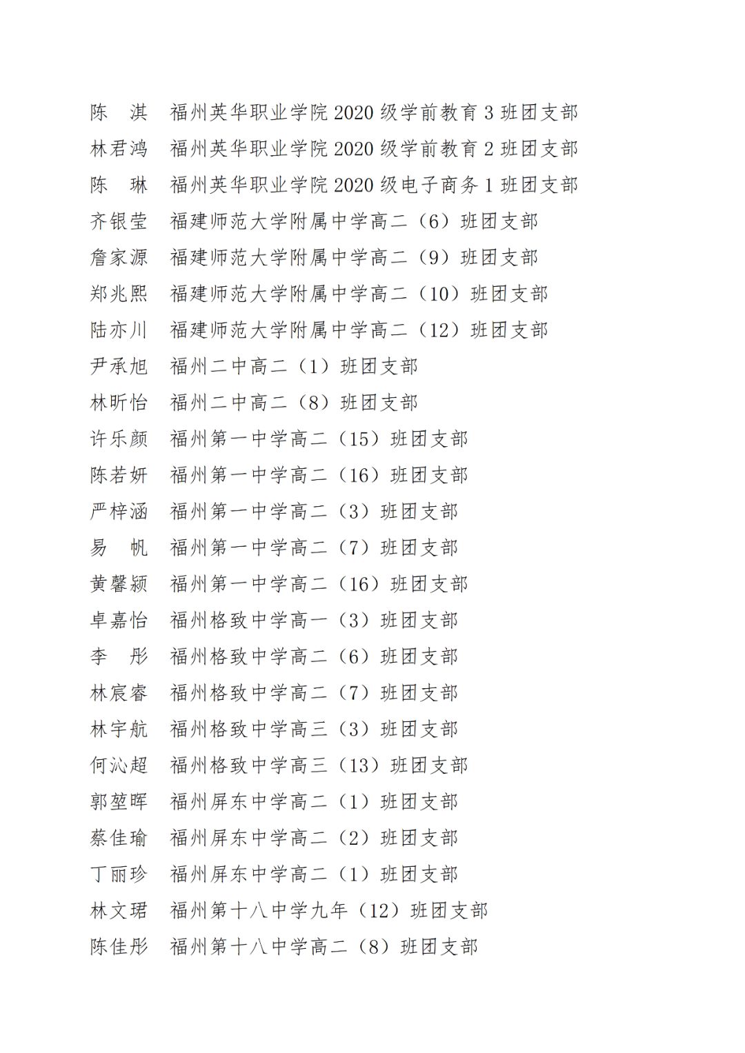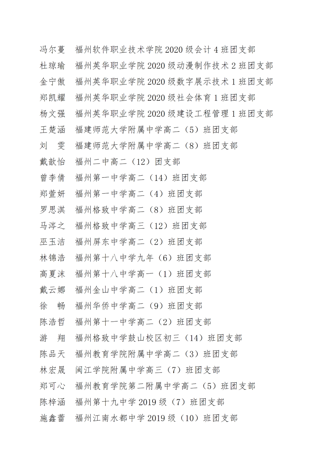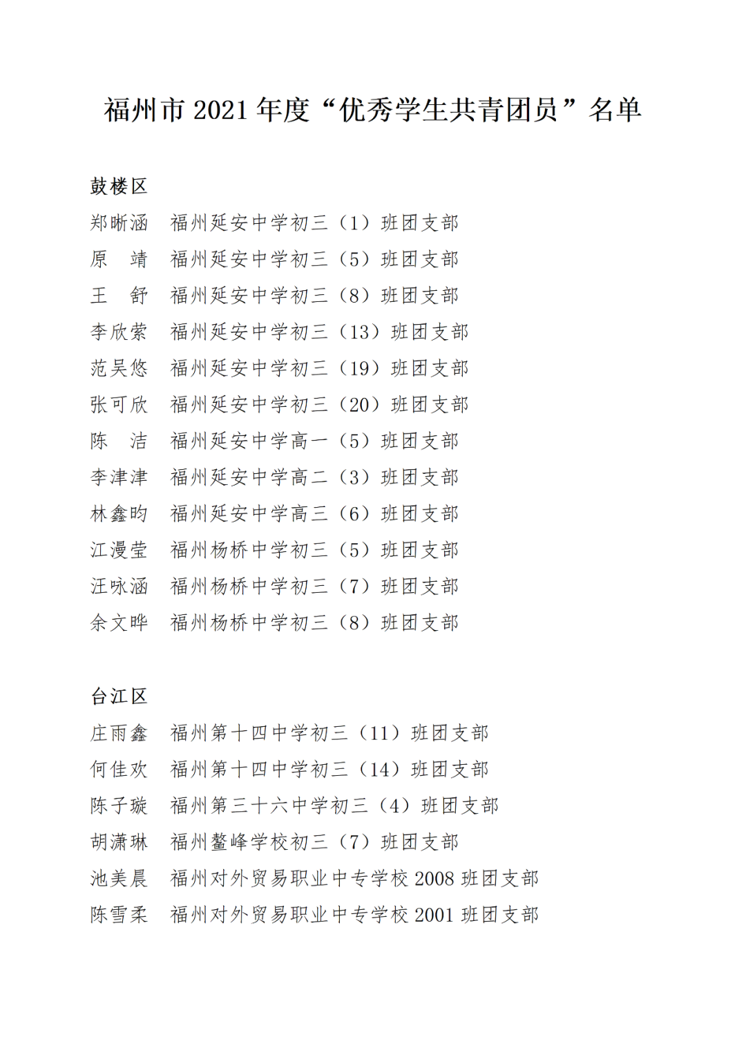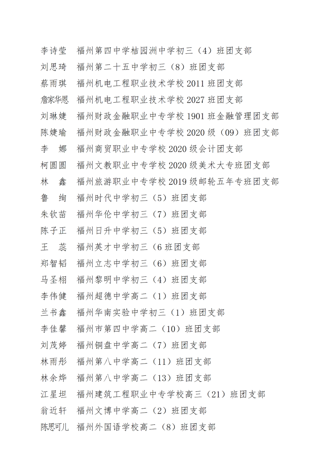 青春心向党,建功新时代! 福州市2021年度“优秀学生共青团员”“优秀学生共青团干部”评选结果正式揭晓! 2021年以来,全市广大在校团员青年深入贯彻落实习近平新时代中国特色社会主义思想,坚持和弘扬“3820”战略工程思想精髓,在助力福州高质量发展超越,加快建设现代化国际城市的火热实践中取得了积极成效,涌现出一批先进典型。经研究,拟对郑晰涵等474名福州市“优秀学生共青团员”、柯宇潞等272名福州市“优秀学生共青团干部”予以通报表扬。 希望受到表扬的学生团员、团干珍惜荣誉,再接再厉。全市各学校团员、团干部要以先进典型为榜样,开拓创新,锐意进取,助力福州全方位高质量发展超越,在加快建设现代化国际城市的火热实践中贡献青春力量。 福州市2021年度“优秀学生共青团员”
