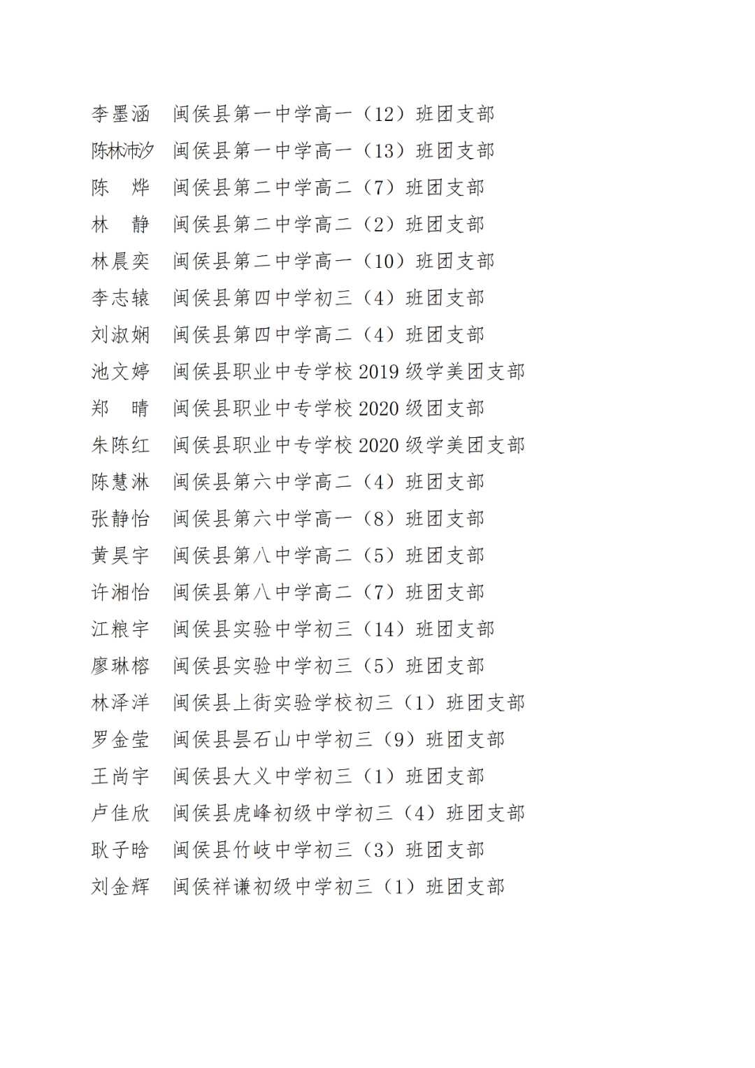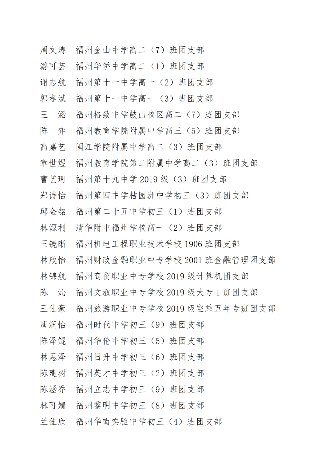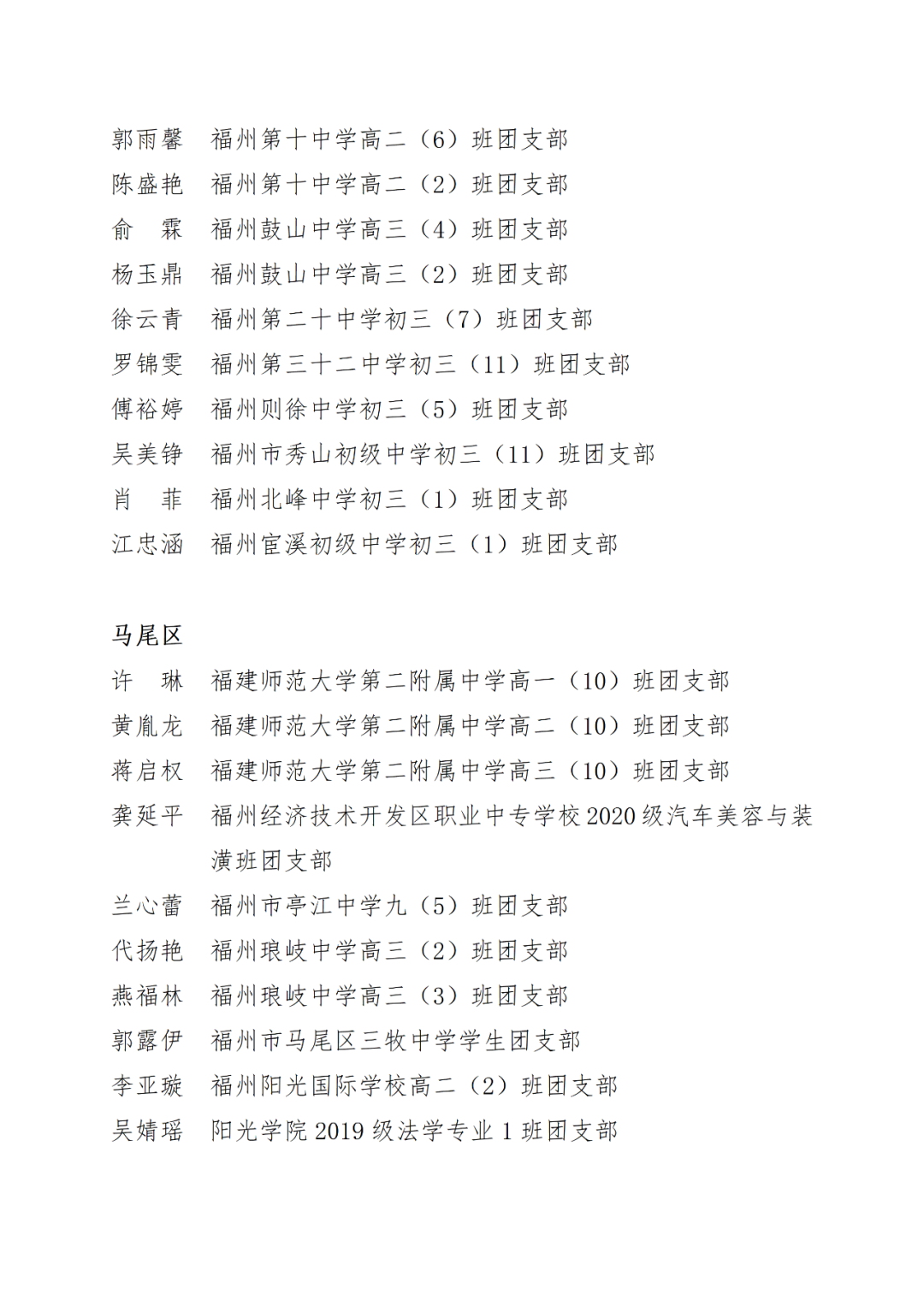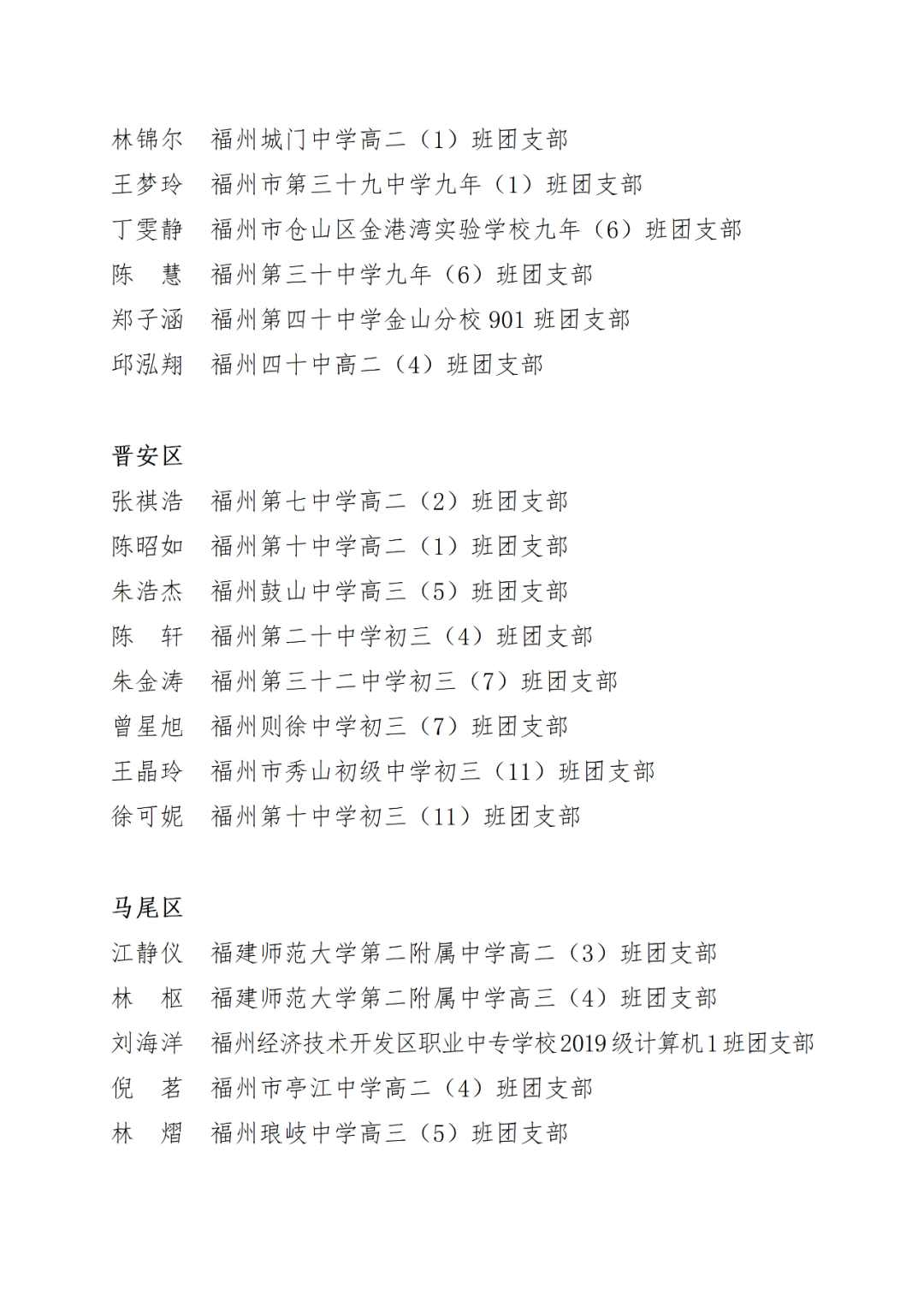 青春心向党,建功新时代! 福州市2021年度“优秀学生共青团员”“优秀学生共青团干部”评选结果正式揭晓! 2021年以来,全市广大在校团员青年深入贯彻落实习近平新时代中国特色社会主义思想,坚持和弘扬“3820”战略工程思想精髓,在助力福州高质量发展超越,加快建设现代化国际城市的火热实践中取得了积极成效,涌现出一批先进典型。经研究,拟对郑晰涵等474名福州市“优秀学生共青团员”、柯宇潞等272名福州市“优秀学生共青团干部”予以通报表扬。 希望受到表扬的学生团员、团干珍惜荣誉,再接再厉。全市各学校团员、团干部要以先进典型为榜样,开拓创新,锐意进取,助力福州全方位高质量发展超越,在加快建设现代化国际城市的火热实践中贡献青春力量。 福州市2021年度“优秀学生共青团员”