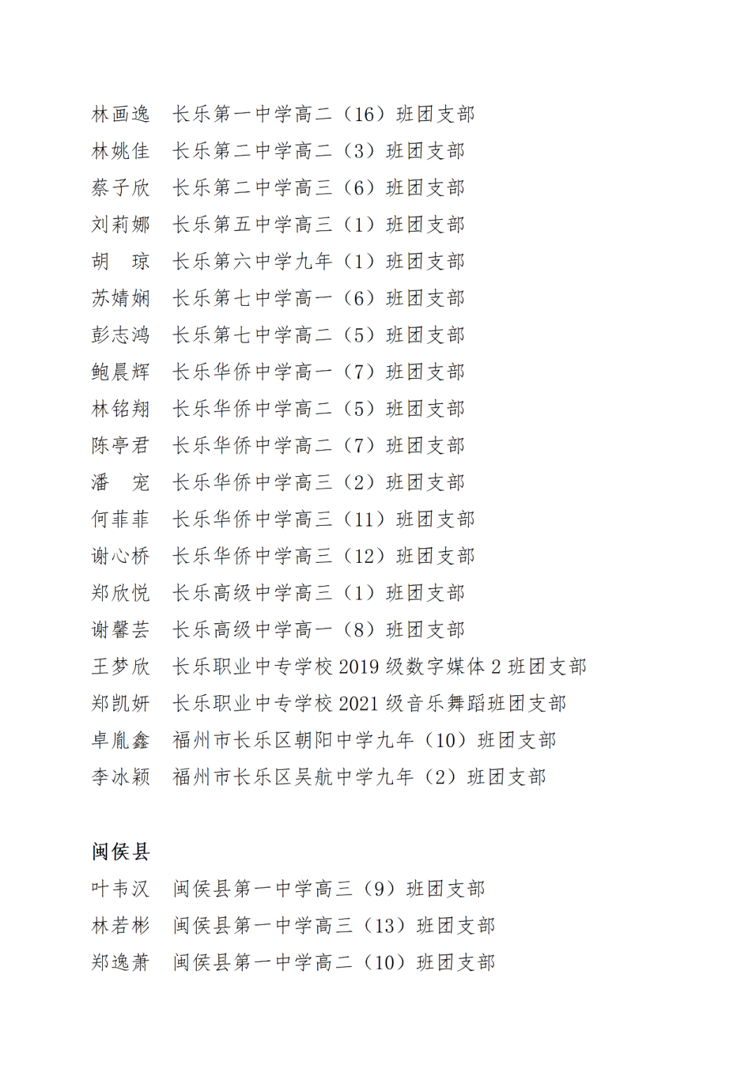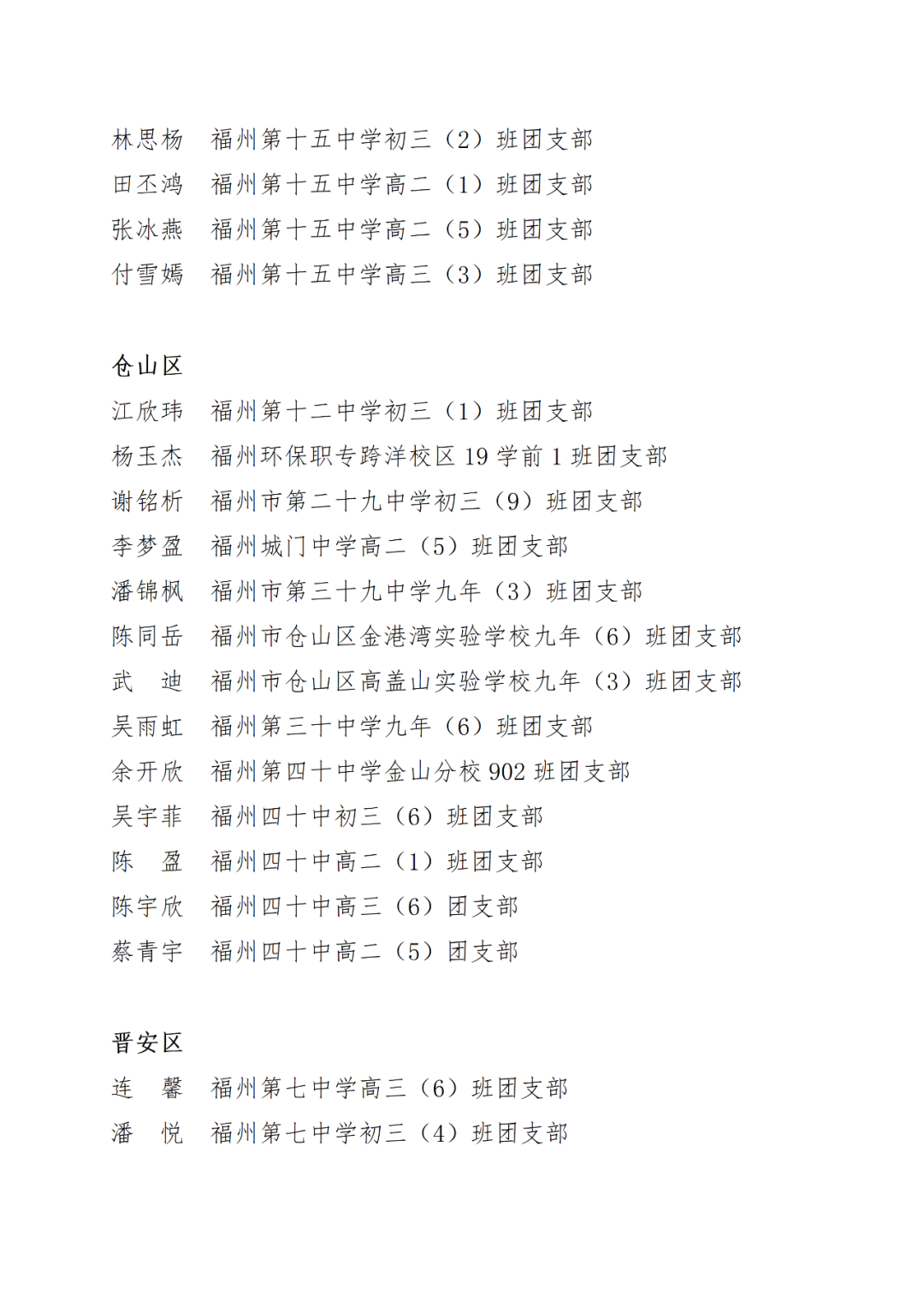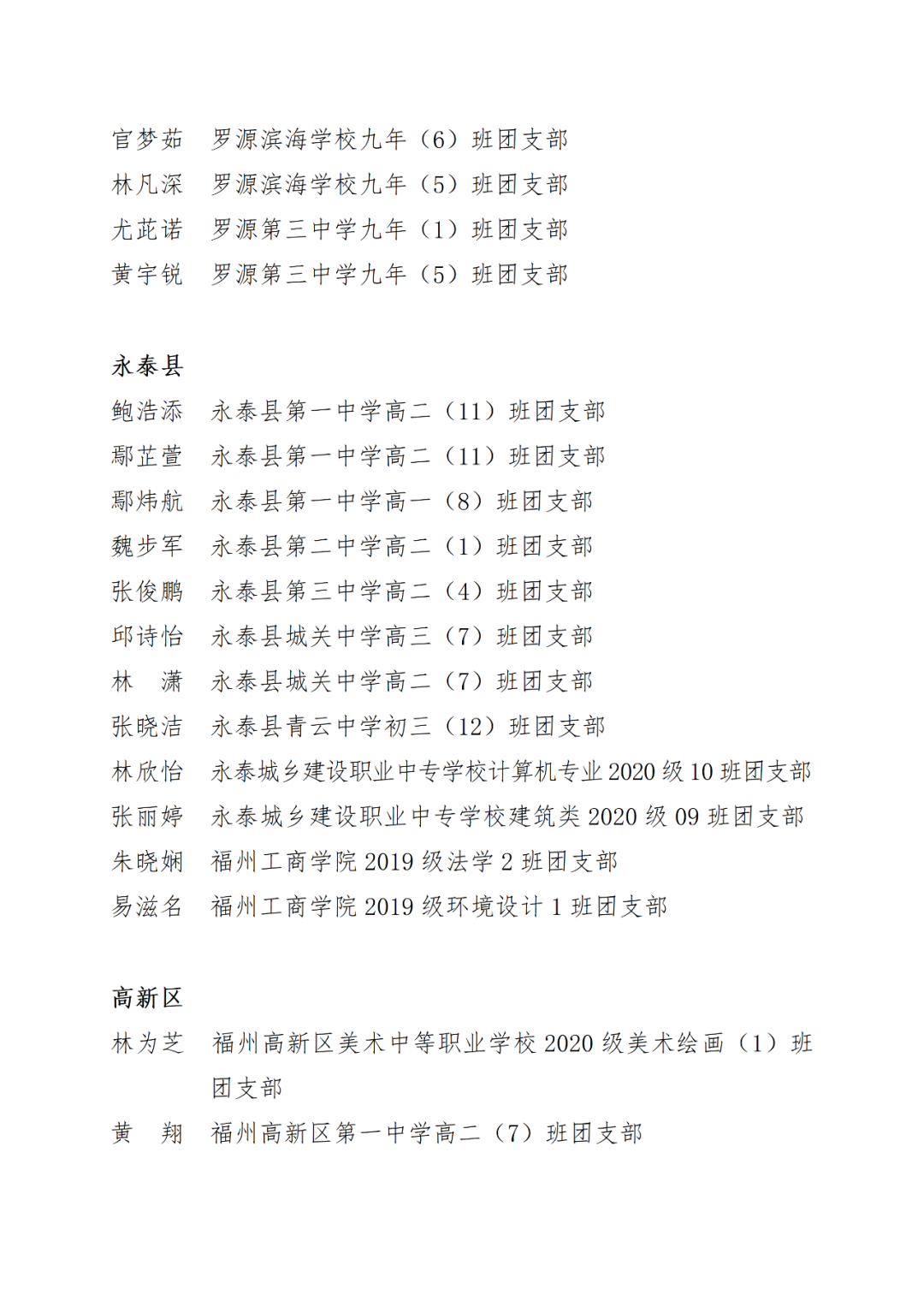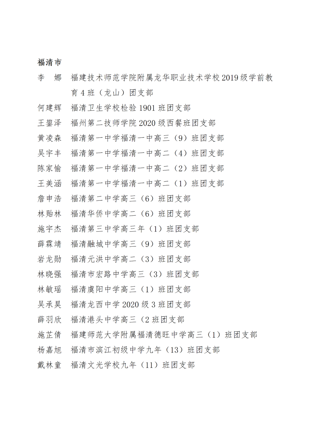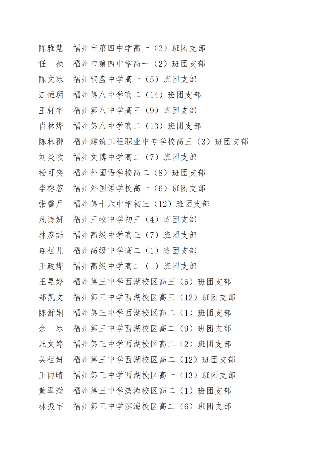 青春心向党,建功新时代! 福州市2021年度“优秀学生共青团员”“优秀学生共青团干部”评选结果正式揭晓! 2021年以来,全市广大在校团员青年深入贯彻落实习近平新时代中国特色社会主义思想,坚持和弘扬“3820”战略工程思想精髓,在助力福州高质量发展超越,加快建设现代化国际城市的火热实践中取得了积极成效,涌现出一批先进典型。经研究,拟对郑晰涵等474名福州市“优秀学生共青团员”、柯宇潞等272名福州市“优秀学生共青团干部”予以通报表扬。 希望受到表扬的学生团员、团干珍惜荣誉,再接再厉。全市各学校团员、团干部要以先进典型为榜样,开拓创新,锐意进取,助力福州全方位高质量发展超越,在加快建设现代化国际城市的火热实践中贡献青春力量。 福州市2021年度“优秀学生共青团员”