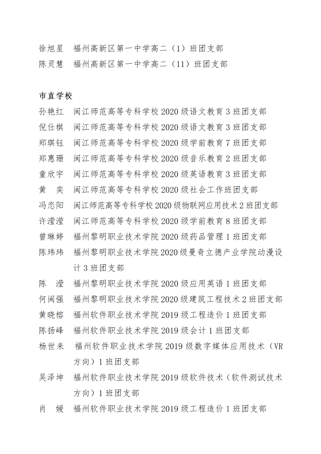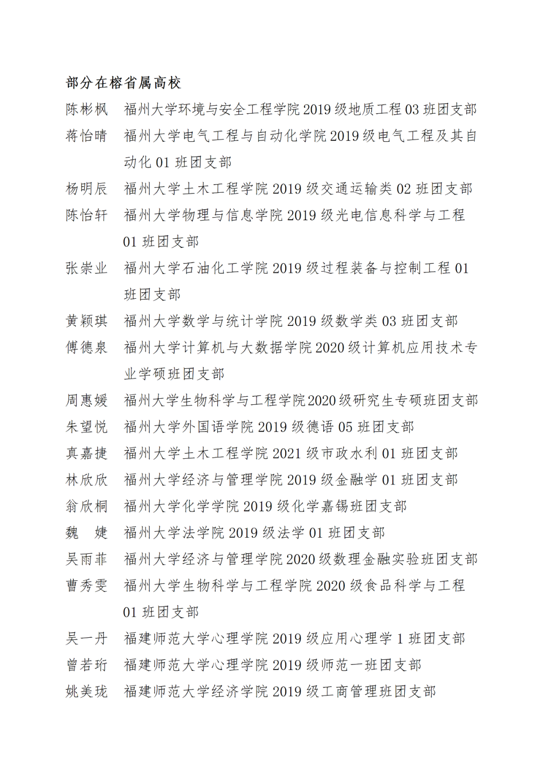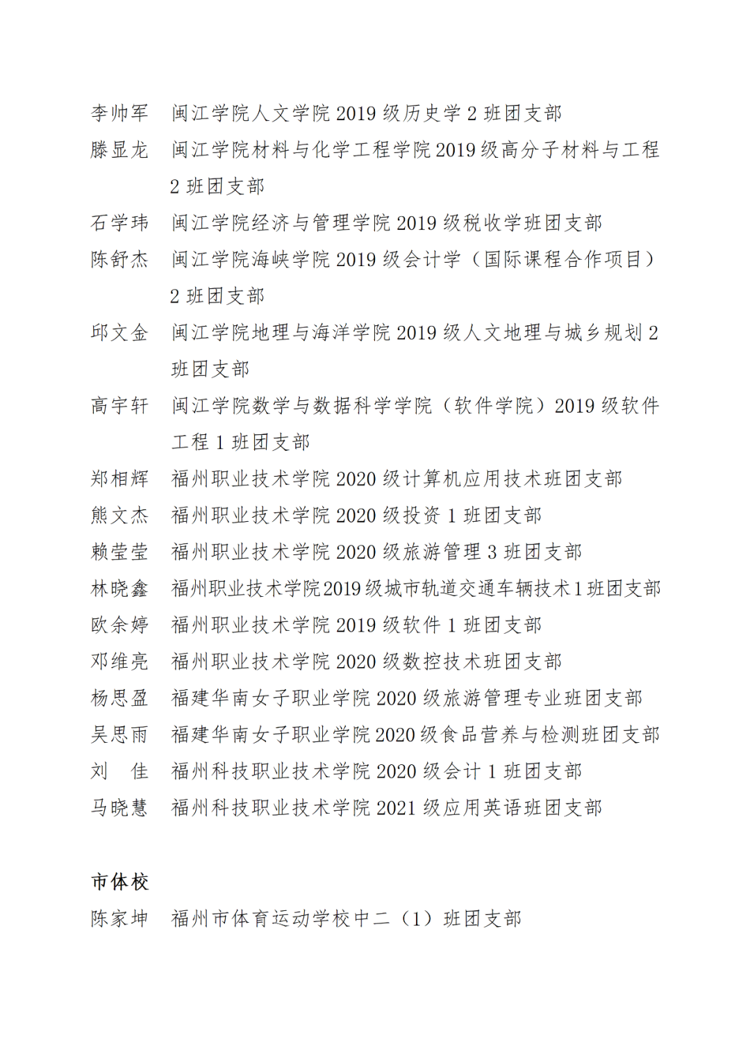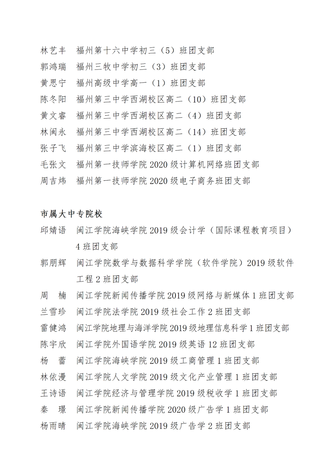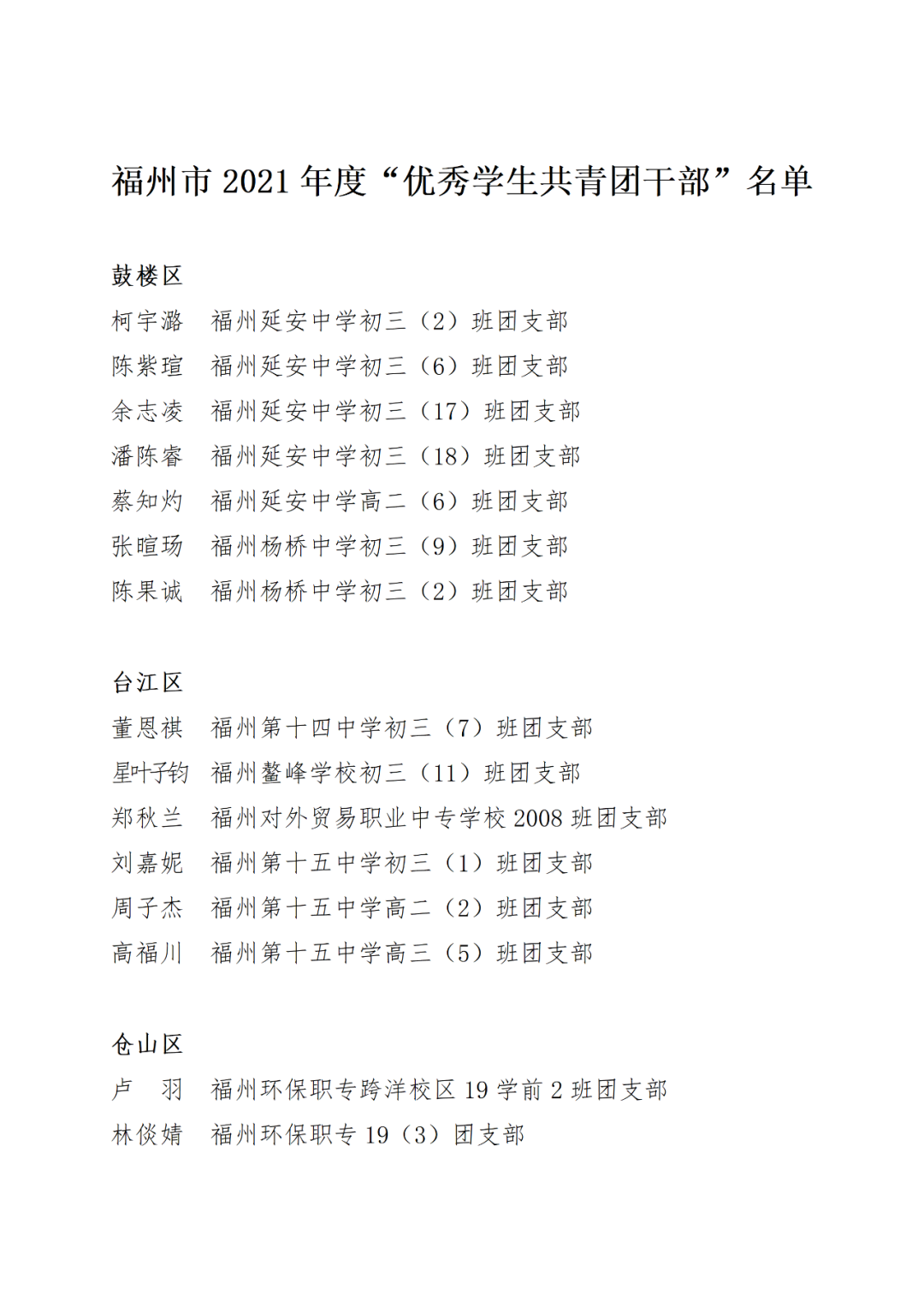 福州市2021年度“优秀学生共青团干部”