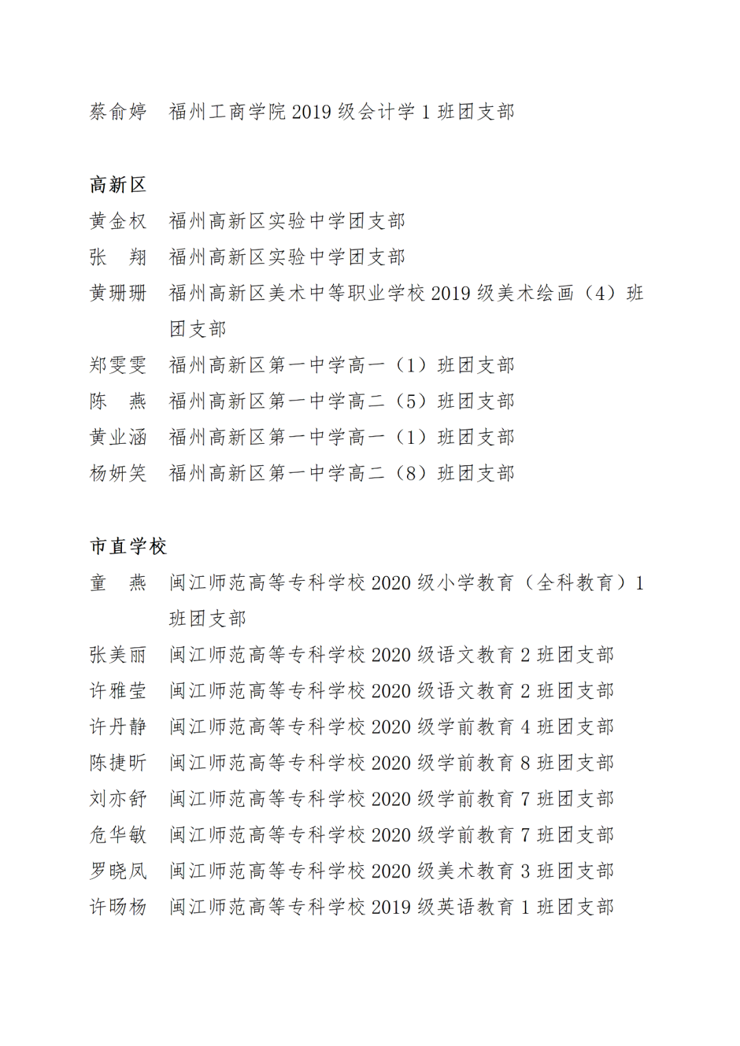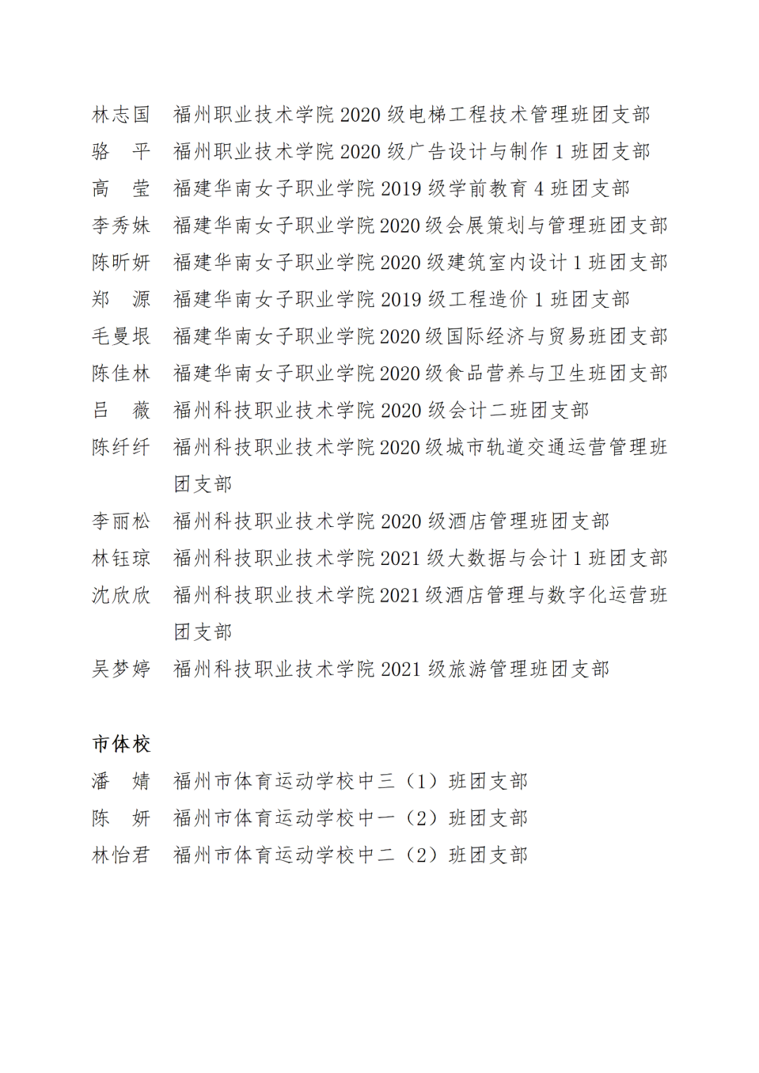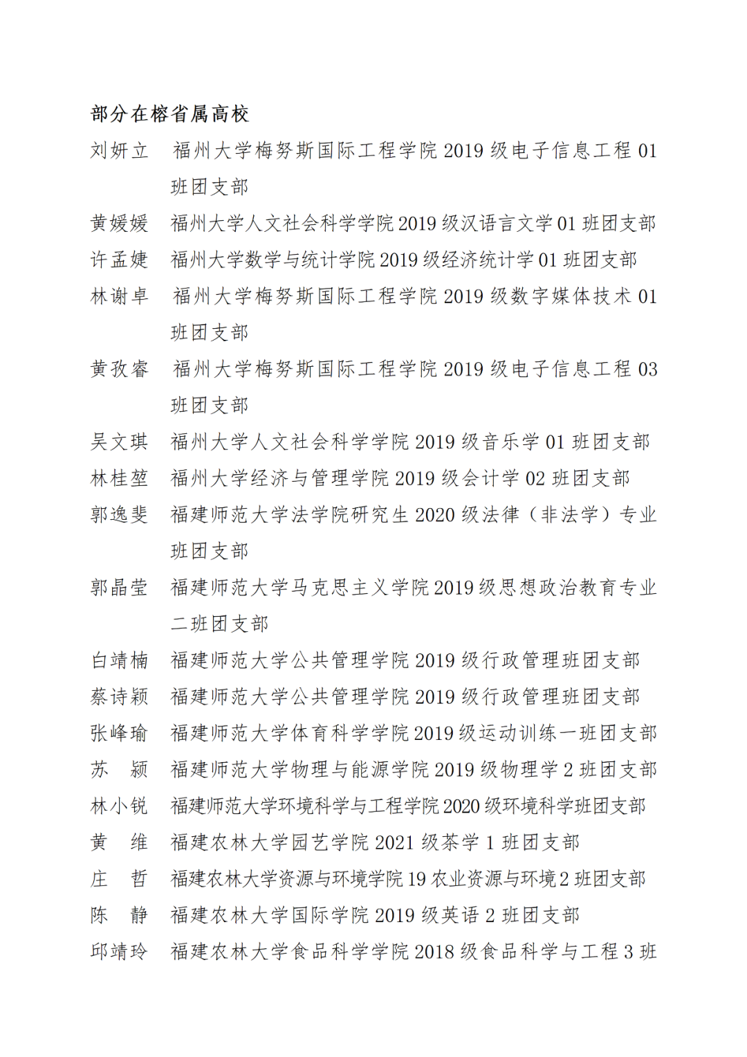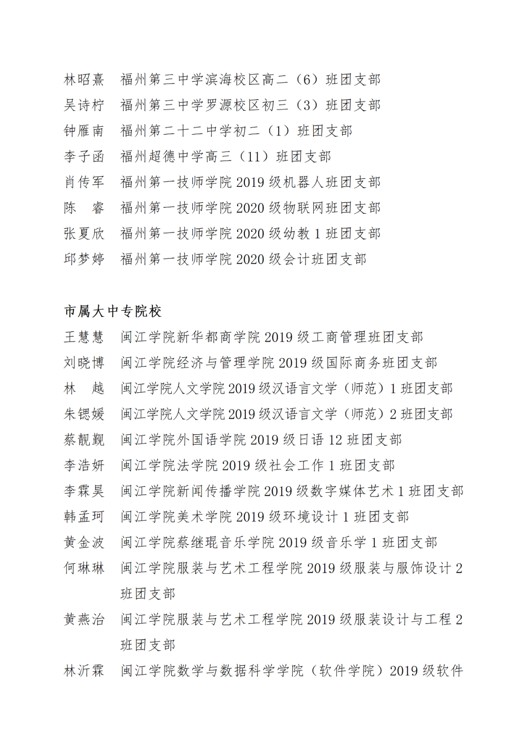 福州市2021年度“优秀学生共青团干部”