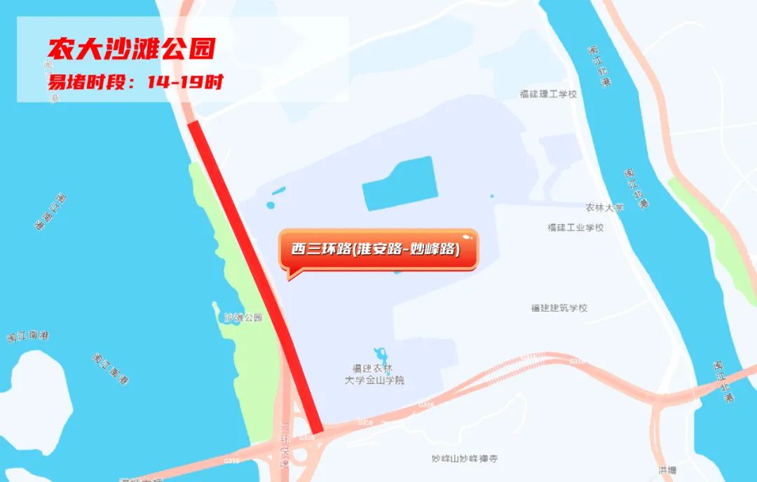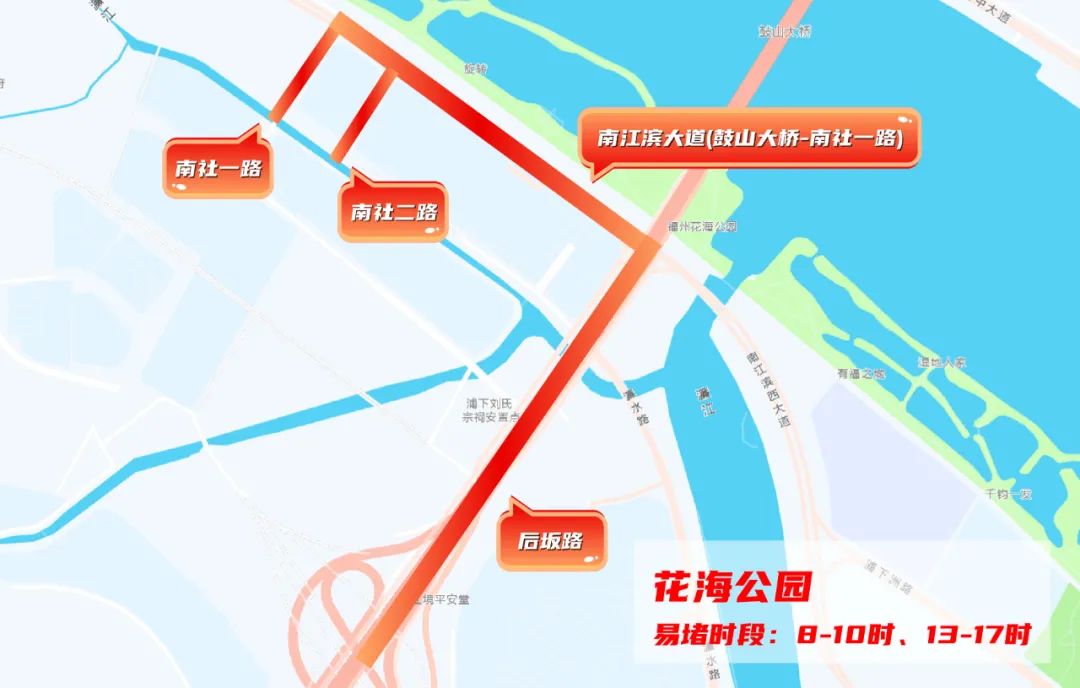 易堵路段为南江滨大道(鼓山大桥-南社一路)、南社一路、南社二路、后坂路,易堵时段为13-17时,高峰通行速度预计为30公里/小时。 9