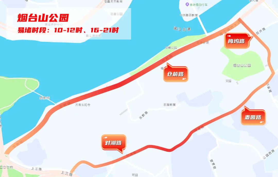 易堵路段为仓前路、梅坞路、麦园路及对湖路,易堵时段为10-12时、16-21时。 8