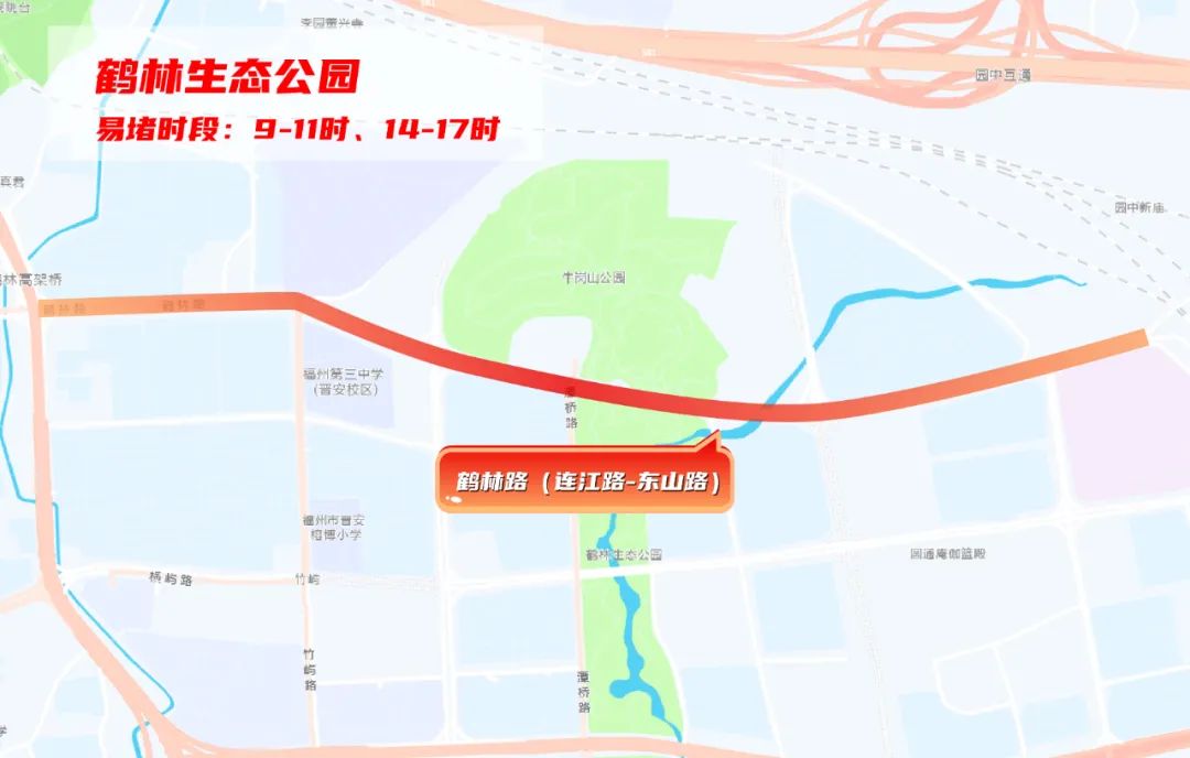 易堵路段为鹤林路(连江路-东山路),易堵时段为9-11时、14-17时,高峰通行速度预计为15公里/小时。 17
