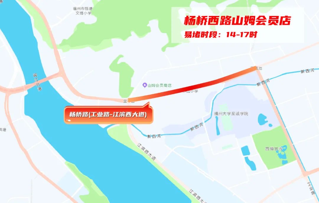 易堵路段为杨桥路(工业路-江滨西大道),易堵时段为14-17时,高峰通行速度预计为15公里/小时。 5