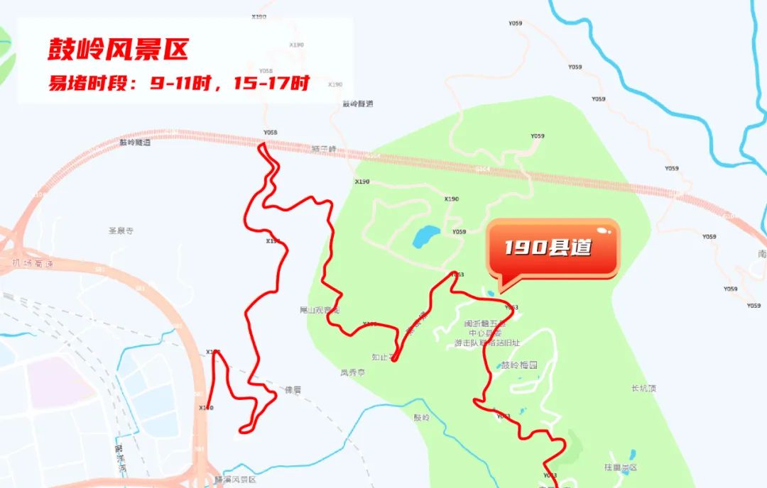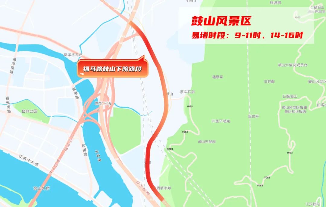 易堵路段为福马路鼓山下院路段,易堵时段为9-11时,14-16时,高峰通行速度预计为25公里/小时。 18