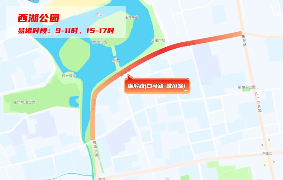 易堵路段为湖滨路(白马路-鼓屏路),易堵时段为9-11时、15-17时,高峰通行速度预计为15公里/小时。 2
