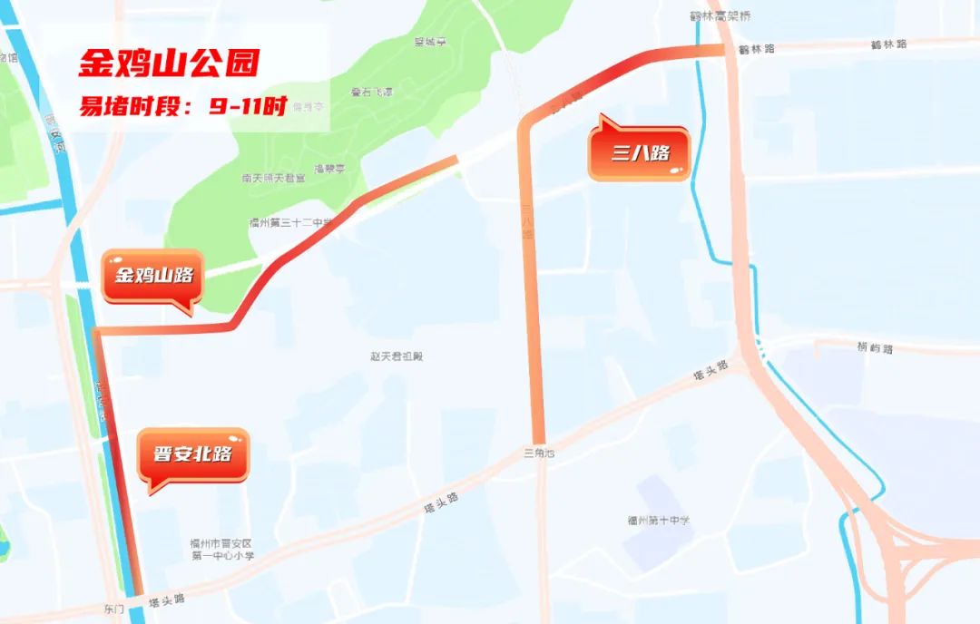 易堵路段为金鸡山路、三八路、晋安北路,易堵时段为9-11时,高峰通行速度预计为15公里/小时。 16