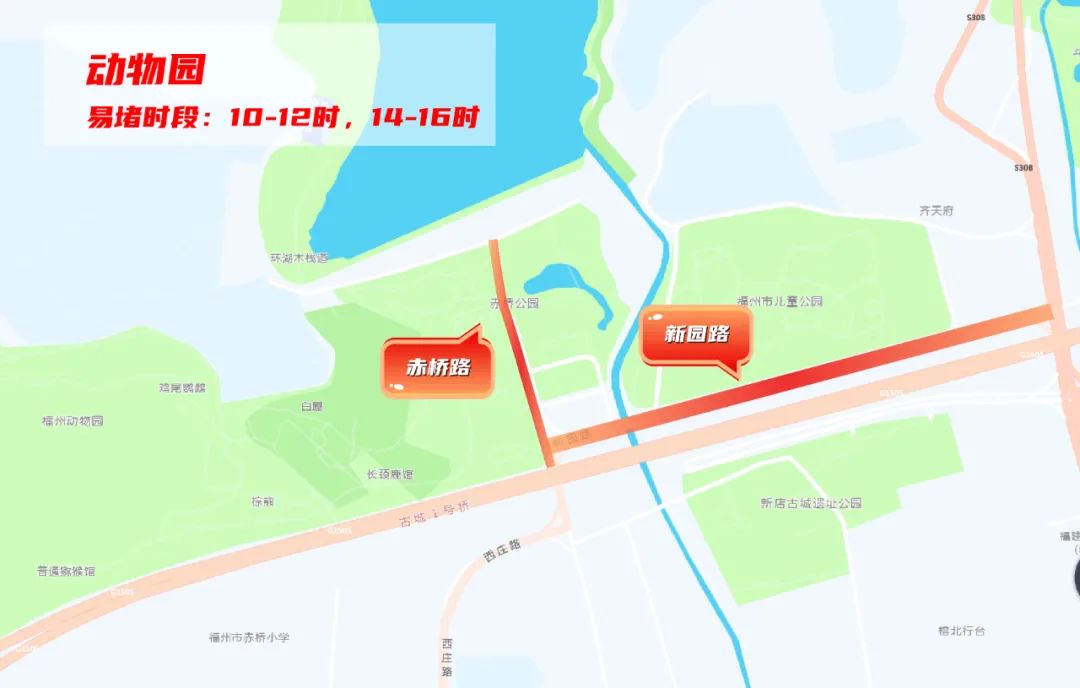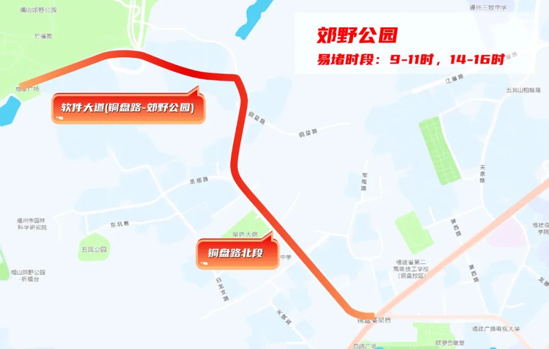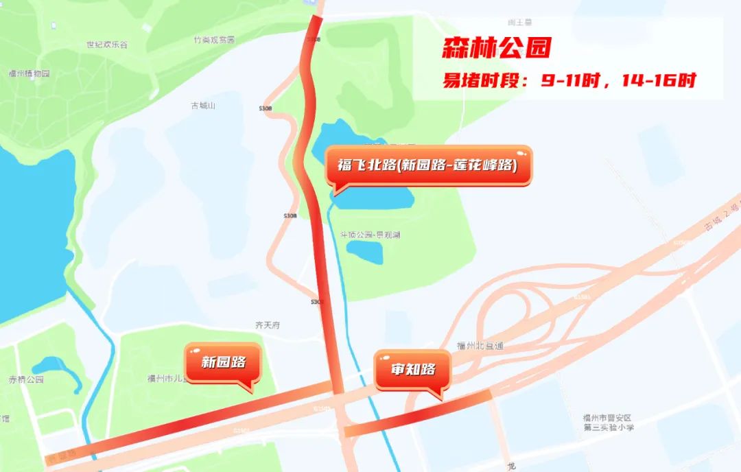 易堵路段为福飞北路(新园路-莲花峰路)、新园路、审知路,易堵时段为9-11时,14-16时,高峰通行速度预计为10公里/小时。 14