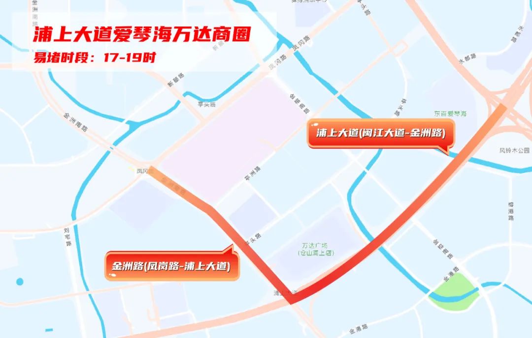 易堵路段为浦上大道(闽江大道-金洲路)、金洲路(凤岗路-浦上大道),易堵时段为17-19时,高峰通行速度预计为15公里/小时。 13