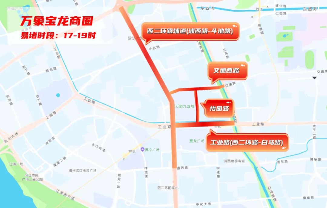 易堵路段为西二环路辅道(浦西路-斗池路)、工业路(西二环路-白马路)、交通西路、怡园路,易堵时段为17-19时,高峰通行速度预计为10公里/小时。 7