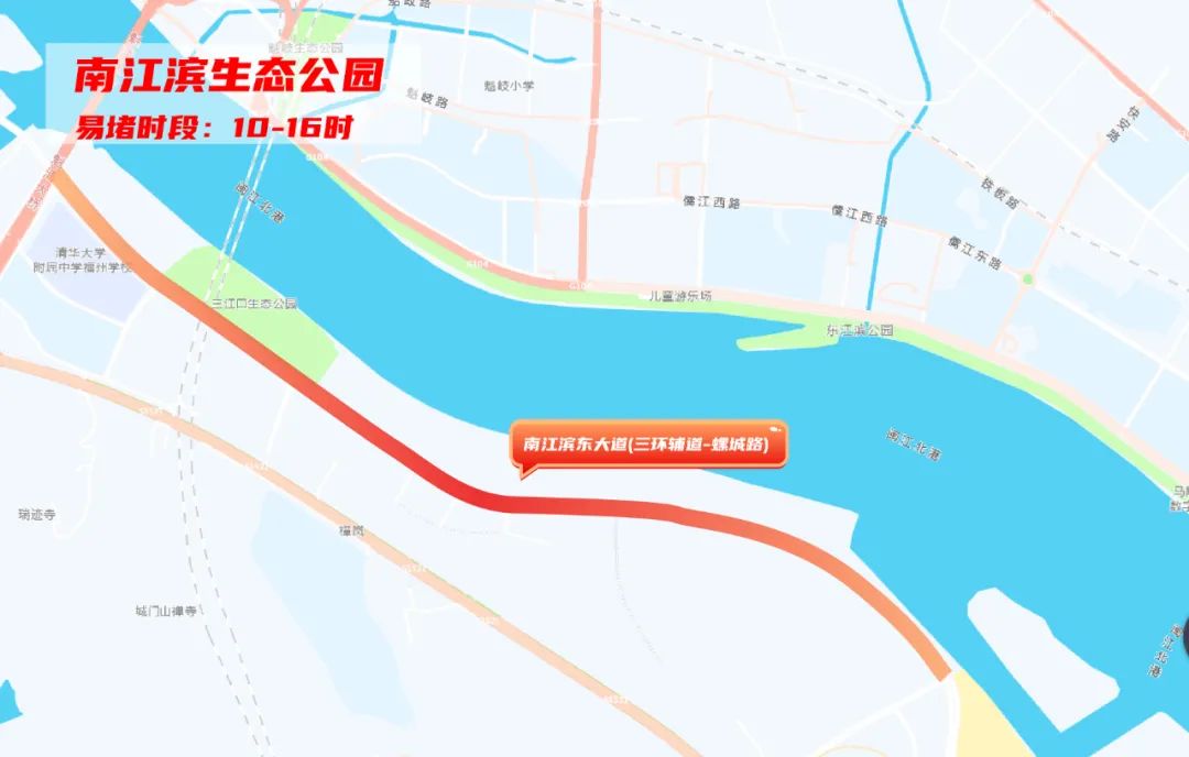 易堵路段为南江滨东大道(三环辅道-螺城路),易堵时段为10-16时,高峰通行速度预计为25公里/小时。 11