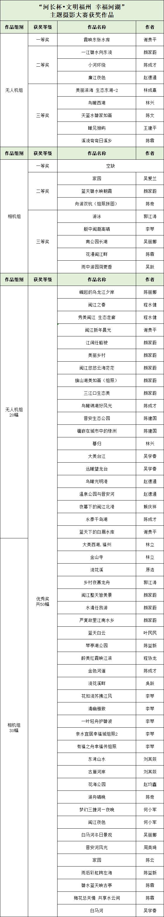 近日,主办方联合市摄影家协会、高校教授、媒体专业人士等组成评委会,对参赛作品分初筛、入围、终评三个环节进行公平、公正、公开评选。经过层层评选,共产生67幅获奖作品。其中: 无人机:一等奖1名(奖金5000元)、二等奖3名(奖金各2000元)、三等奖5名(奖金各1000元); 相机组:一等奖:空缺、二等奖3名(奖金各1000元)、三等奖5名(奖金各500元), 优秀奖:50名(无人机组20名,相机组30名,奖金各200元); 以上获奖人除现金奖励外,还将分别给予颁发获奖证书。 现将拟获奖作品及姓名予以公示,公示时间为6月9日至6月15日(5个工作日)。公示期间,获奖者本人须至承办单位现场签署《版权承诺书》并提供身份证复印件(地址:福州市鼓楼区小柳路85号4楼)。如对获奖作品有异议,请向福州市河长制办公室反映。此外,主办方有权邀请获奖人现场指认拍摄地点,如情况不属实,将取消获奖资格并由当事人支付所产生的费用。(电话:0591-83509337邮箱:2123763897@qq.com) 公示如下: