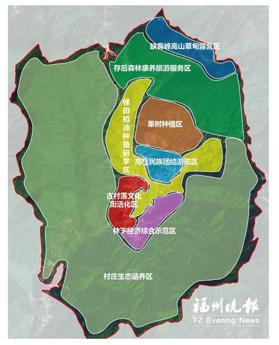 高岳村项目规划图。 据了解,高岳村位于潘渡镇西北部,背靠连江第一高峰——缺鼻峰(海拔1029米),完整呈现了山、溪、林、田、草、古民居等于一体的自然和人文景观,素有“贵安后花园”的美誉。 其中,高山草甸总面积达650亩、海拔约730米,是露营好去处。与省内几大草场相比,这里草甸更为错落有致、视野更为宽阔,周围和沿途植物更为丰富多样。 按照总体策划,高岳村将重点打造八大功能区——村庄生态涵养区、古村落文化街活化区、高岳民族团结游览区、梯田稻油种植研学区、果树种植区、存后森林康养服务区、缺鼻峰高山草甸露营区和林下经济综合示范区。