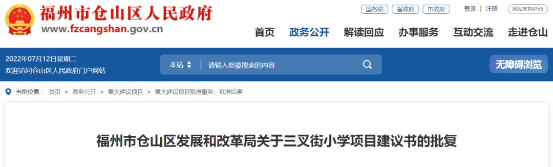 近日,仓山区人民政府网站发布仓山区发展和改革局关于三叉街小学项目建议书的批复,原则同意三叉街小学项目开展前期工作。