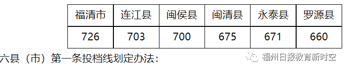 7月13日下午,福州市中招办根据《2022年福州市高级中等学校招生考试工作实施细则》,划定各招生区域普高第一条投档线、市区普高第二条投档线、普高最低投档控制线、民办普高体育艺术特色班最低控制线、五年制高职最低投档控制线。受平潭综合实验区委托,平潭综合实验区2022年中考中招工作由福州市中招办代办。具体如下: 一、福州市各投档线划定 (一)福州市区普高第一条、第二条投档线 福州市区普高第一条投档线划定办法:按福州一中、福州二中、福州三中西湖校区、福州四中、福州格致中学、福州八中、福建师大附中、福州高级中学、长乐一中吴航校区等9所已确认及建设中的示范性普通高中学校的普通班(不含特色班和自主招生,下同)面向市区招生计划总数的9.5%划定普通高中第一条投档线,为749.5分。 福州市区普高第二条投档线划定办法:按福州一中、福州二中、福州三中西湖校区、福州四中、福州格致中学、福州八中、福建师大附中、福州高级中学和长乐一中吴航校区等9所一级达标学校普通班面向市区招生计划总数的70%划定普通高中第二条投档线,为723分。 (二)六县(市)普高第一条投档线