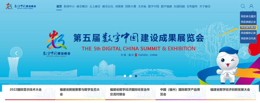 防疫要求 请所有观众共同遵守疫情防控要求,遵从工作人员引导,出示健康码、48小时内核酸阴性证明、身份证或预约码等有序进场,正确佩戴口罩,不扎堆、不聚集、保持安全社交距离。 为配合防疫检查,请携带本人居民身份证。 观众参观入场方式 观众参观指南 专业观众日入场方式 本届成果展特别设立专业观众日(7月22日9:00-17:00、23日15:00-19:00),专业观众日将组织新产品新技术发布会等多场专业活动。 专业观众日参观须提前通过数字中国小程序完成在线注册,注册方式如下: 步骤一 关注数字中国建设峰会官方公众号 在菜单栏点击“观展报名” 进入“数字中国建设峰会”官方小程序
