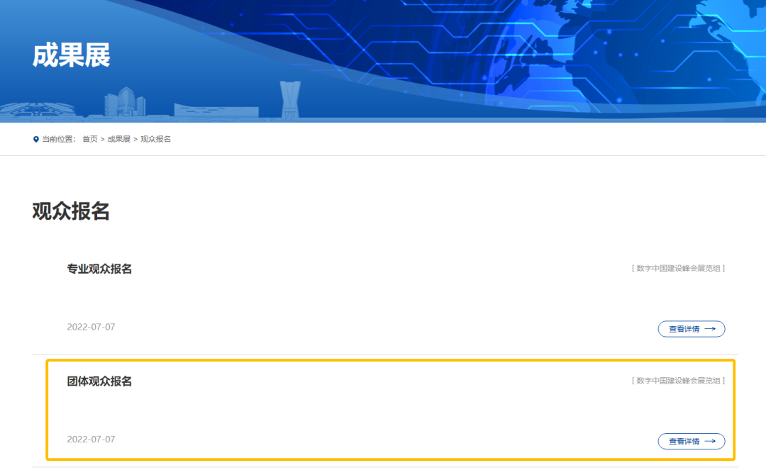 公众开放日入场方式 公众开放日 (7月24日、25日、26日),普通观众请持本人身份证入场参观,无须预约注册;儿童参观不需要出示证件但需成人陪同。 团体观众参观报名方式 团体观众参观指南 针对团队观众(人数>10人),组委会还安排了多项贴心服务: 便捷快速入口:为团体观众设置专门入口,与普通观众分流便捷入场; 讲解员全程带队:为团体观众安排讲解人员,对各场馆展览成果进行专业讲解; 申请通过组委会审核后,将有专人联系贵单位领队。具体报名方式如下: 步骤一 前往数字中国建设峰会官网, 右上角点击“我是展览观众”