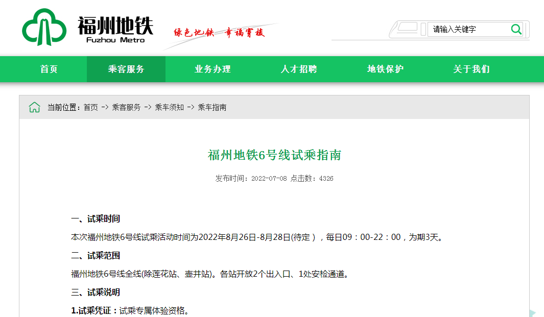 一、试乘时间 本次福州地铁6号线试乘活动时间为2022年8月26日-8月28日(待定),每日09:00-22:00,为期三天。 二、试乘范围 福州地铁6号线全线(除莲花站、壶井站)。各站开放2个出入口、1处安检通道。