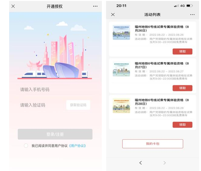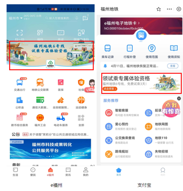 三、试乘说明 1.试乘凭证:试乘专属体验资格。 2.试乘规则:乘客持试乘专属体验资格,在福州地铁1、2、5、6号线乘车,行程中含6号线任一车站(除莲花站、壶井站)刷码进站或出站记录,可享受当次行程免费,当日不限行程次数。 四、试乘礼品 为感谢各位乘客参与此次试乘活动,您可在6号线任一站点客服中心领取6号线开通纪念封,每人限领两枚;或积极参与线上、线下试乘问卷调查,也可领取一枚6号线开通纪念封。礼品精美,数量有限,送完即止。 6号线开通当日,可持纪念封至南门兜站、下洋站、金山站、郑和站加盖开通纪念戳(详情请关注福州地铁微信公众号)。 五、试乘问答Q&A 1.关于试乘专属体验资格 Q1:如何领取试乘专属体验资格? A:8月22日零时起至活动结束期间,登录e福州APP首页、支付宝APP福州地铁小程序,找到福州地铁6号线试乘专属体验资格领取页面,点击链接后即可领取试乘三日的专属体验资格。操作步骤见下图: 第一步:打开链接