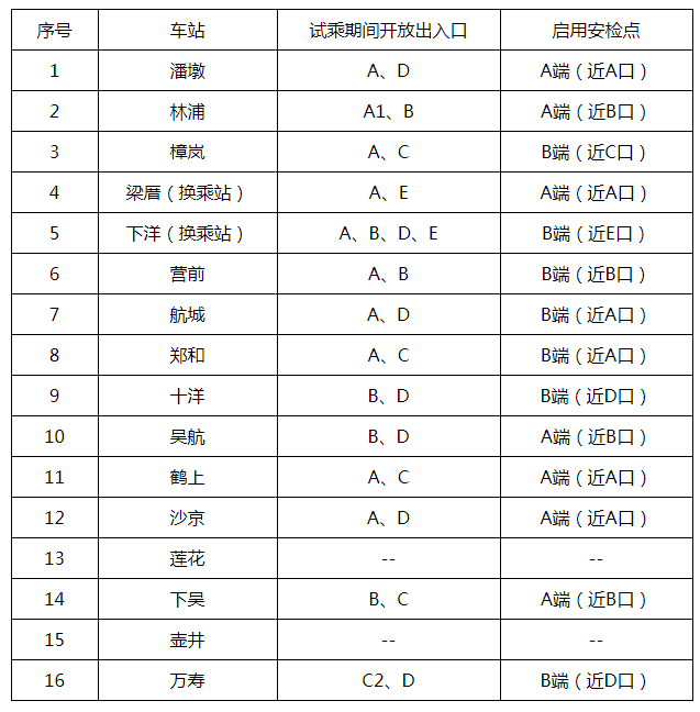 六、注意事项 1、6号线各站点在开放试乘出入口设置核验点,乘客从6号线进站时请主动出示各APP专属体验资格,由工作人员核验无误后进站乘车;乘客进站乘车须全程规范佩戴好口罩、配合车站测温安检、出示本人健康码;乘客也可使用福州市敬老卡、榕城通学生卡、身份证等有效证件在健康码终端查询机上查验本人“健康码”信息。 2、乘客禁限带物品、乘车安全指引及车站应急设备使用指引等事宜请关注福州地铁微信公众号。 |