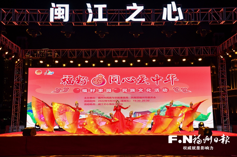 2022-10-01 09:41:42 来源:福州日报 责任编辑:黄丽红 作者:9月30日晚,由团市委、市民宗局共同主办的“福籽同心爱中华”第十五个民族团结进步宣传月暨“福籽家园”民族文化系列活动再次亮相“闽江之心”海丝大舞台,身着民族服饰的演员与观众载歌载舞,喜迎国庆。