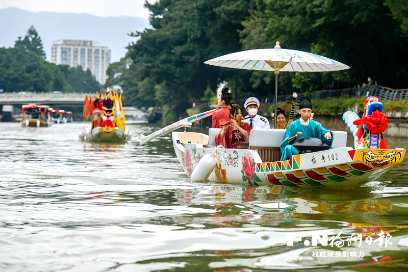 率先启航的两艘龙舟融入“朝天龙”的传统龙舟头设计和莲花等吉祥主题图案,福气满满,配合电音三太子的热情表演,烘托出元旦佳节的温暖喜庆;紧随其后,4艘新型游船分别以“开闽第一人”王审知兴修水利保境安民,航海家郑和于长乐太平港七下西洋,清代名将左宗棠首创马尾船政开启中国造船业新篇章,启蒙思想家严复入船政学堂译《天演论》开启民智等名人故事为主题,在水上串起生动的千年水文化历史。
