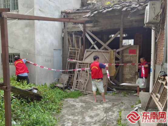 仓山区党员干部给存在安全隐患的房屋拉警戒线。图源仓山区委组织部 仓山 仓山区委组织部发出《防汛防台风倡议书》,号召全区各级党组织充分发挥先锋模范作用,切实保障人民群众生命财产安全。全区5000多名党员干部主动响应、闻令而动,下沉防汛防台风一线,组建防汛防台风党员先锋队,盯牢防御重点部位和薄弱环节,加强监测巡查,提前预置应急处突力量。13个镇街,101个行政村,116个社区, 852个小区(自然村)网格党员干部迅速出动,通过入户宣传、小区广播、微信群、公众号等渠道不断更新台风资讯和防汛防台风相关知识,提醒居民做好防汛防台风准备工作,全力以赴筑牢防风防汛“红色堤坝”。
