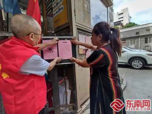 台江区党员干部下沉小区粘贴减灾救灾宣传册。图源台江区直机关工委 台江 台江区直机关各级党组织小区第一书记闻风而动、深入一线,带领干部群众全力以赴做好防风防汛工作。在台风登陆前夕,第一书记们迅速下沉共建小区,协助社区做好隐患排查处置工作,对易涝区域、危旧房屋、河道、低洼地带等区域进行重点巡查。同时,通过“五级网格微信群”“喇叭”、入户敲门、小区LED宣传屏、拉横幅、粘贴减灾救灾宣传册等线上+线下宣传方式,引导群众有序防风避险。