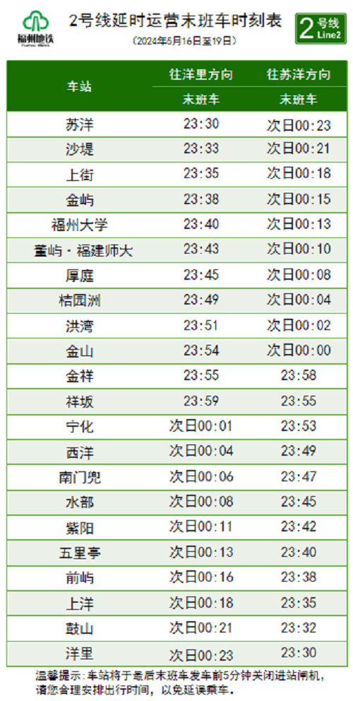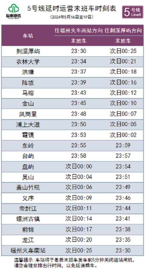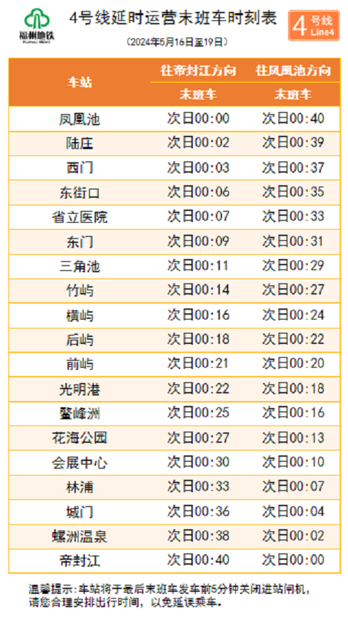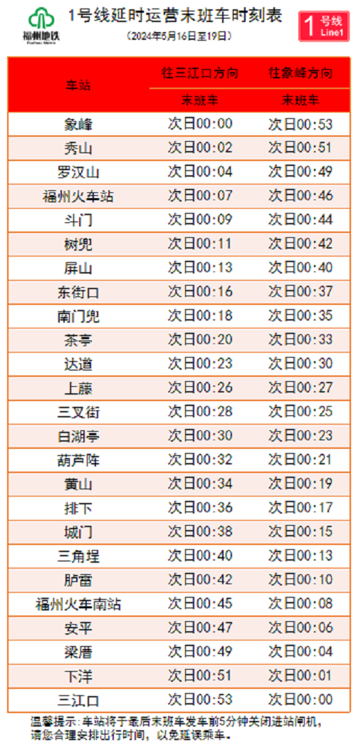 5月16日至19日,福州海峡奥林匹克中心将举办周杰伦世界巡回福州站演唱会。 运营调整 延时运营服务 5月16日至19日连续四天期间,地铁1号线、2号线、4号线、5号线运营服务时间将有所延长。其中,地铁2号线、5号线延长运营30分钟,末班车始发时间延至23:30;对应换乘衔接的地铁1号线、4号线延长运营1小时,末班车始发时间延至次日00:00。地铁6号线运营末班车始发时间维持不变仍为22:30。 增加运力投放 5月16日至19日期间,全线网加强高峰时段客流监测,通过增加备用车数量、调整备用车存放地点等措施,进一步优化线网备用车方案。根据运营线路实际客流情况,灵活加开备用列车,适时增加运力投放,提升线网运力水平和客流疏散能力。 5月16日至19日期间,地铁1号线、2号线、4号线、5号线 延时运营末班车时刻表如下: |