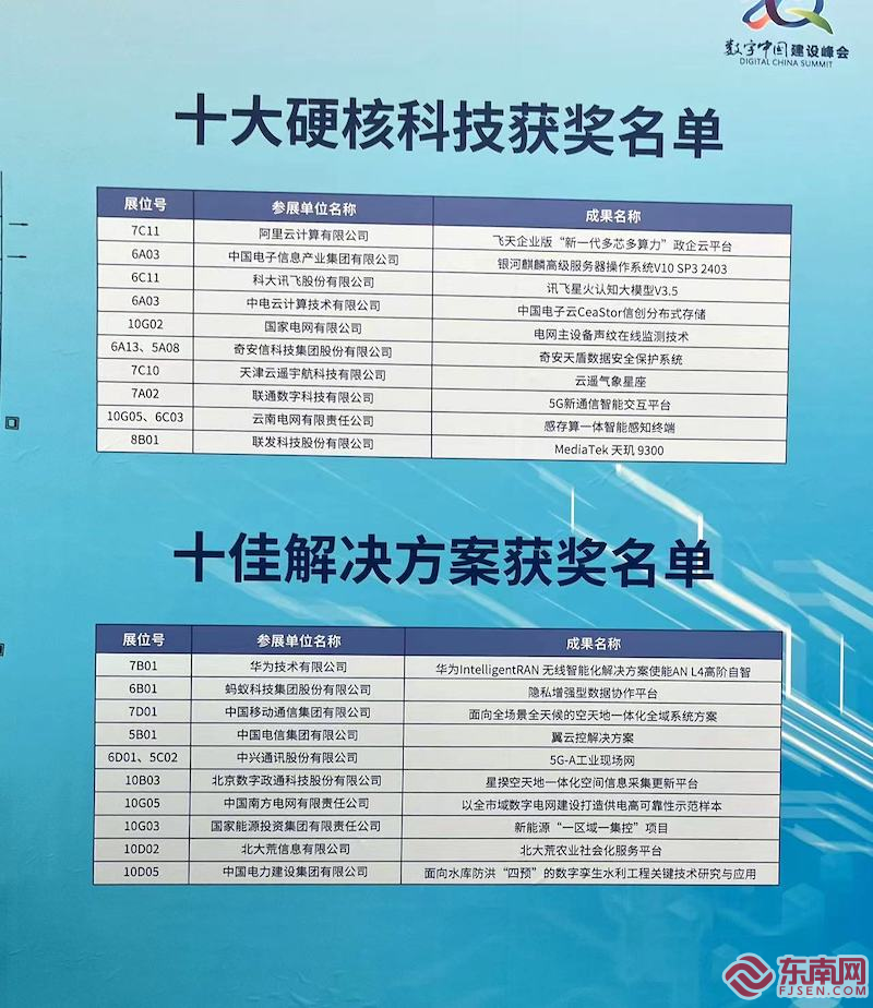 颁奖现场。东南网记者朱琳 摄 本届最佳成果遴选活动,充分展示了一大批数字化技术新成果、数字化实践新案例,彰显数字化领域建设者及贡献者的风采,为数字中国建设的最新成果搭建了全方位的推广平台。 据了解,组委会特邀相关领域专家,经过三轮严格遴选,从180家单位选送的594项成果中,最终评选出“十大硬核科技”“十佳解决方案”两大奖项。 “十大硬核科技”奖项,重点遴选技术领先、创新性强,能够推动“卡脖子”核心技术、关键基础技术创新应用的产品(项目)。“十佳解决方案”奖项,重点遴选适用性强、推广性强,能够推动生产方式、生活方式和治理方式发生变革的数字化解决方案。