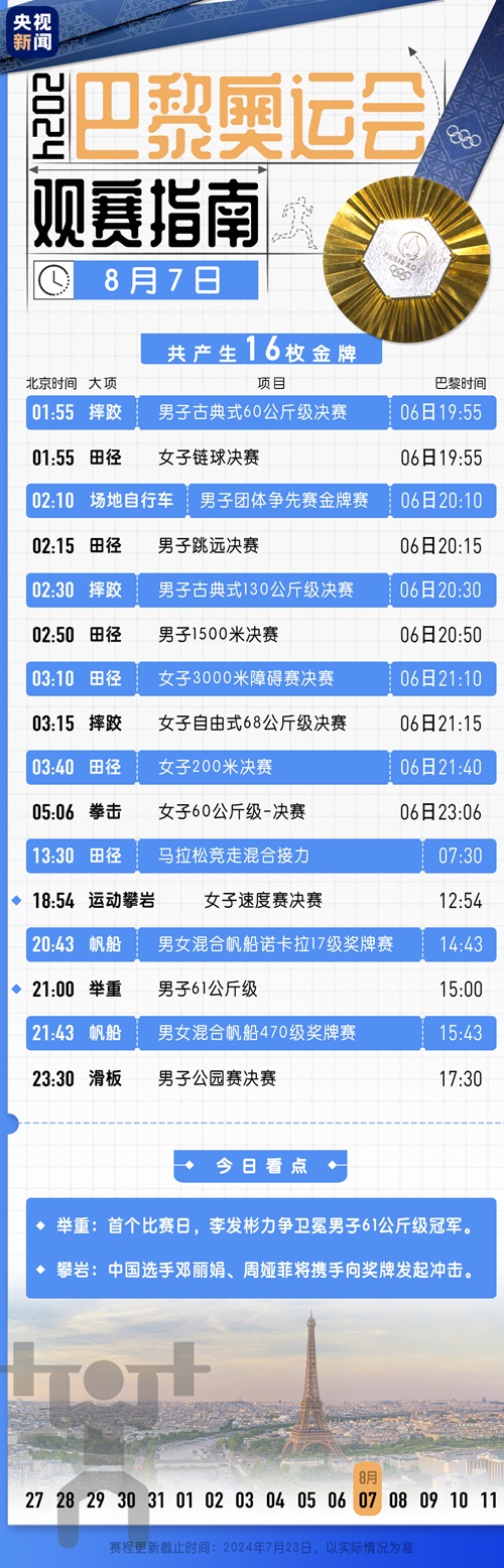 李发彬。图源:新华社 在田径比赛中,林雨薇将在女子100米栏项目中出场,这是她第一次参加奥运会。陈静乐将继续在帆船水翼风筝板预赛轮中争夺半决赛的资格。 此外,中国军团在多个项目中也将向金牌发起冲击。花样游泳项目首金来自集体技巧自选比赛,中国花样游泳队将向着历史首枚奥运金牌发起挑战。攀岩将迎来女子速度赛决赛,中国选手邓丽娟、周娅菲将携手向奖牌甚至金牌发起冲击。侯志慧将亮相举重女子49公斤级决赛。此外,跆拳道项目争夺打响,首日产生两枚金牌,中国选手郭清出战女子-49公斤级比赛。 更多观赛指南↓↓