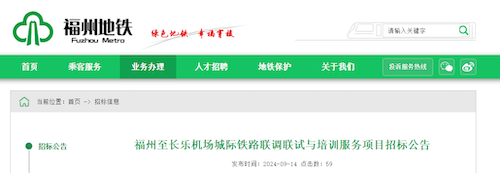 14日,福州地铁官网发布福州至长乐机场城际铁路联调联试与培训服务项目招标公告。该项目招标范围及内容为福州至长乐机场城际铁路联调联试与培训服务,包括安全评估咨询服务、运营调试咨询服务、运营岗位培训服务等三方面内容。