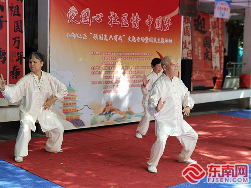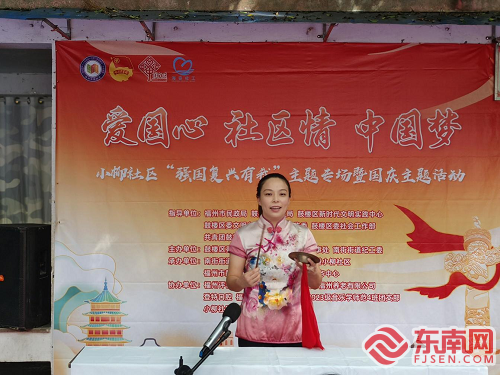 《癫和尚插青记》节目表演。小柳社区供图 在这金秋送爽、丹桂飘香的美好时节,即将迎来伟大祖国的生日。活动现场,小柳社区社会组织为本次活动准备了精彩的歌舞、太极表演,展现了社区居民积极向上的精神面貌。福州评话伬艺传习所谢秋萍老师的节目《癫和尚插青记》与福建师范大学音乐学院2023级音乐学师范4班团支部带来的歌曲《灯火里的中国》更是让现场观众感受到了传统文化的魅力与无限的青春活力。
