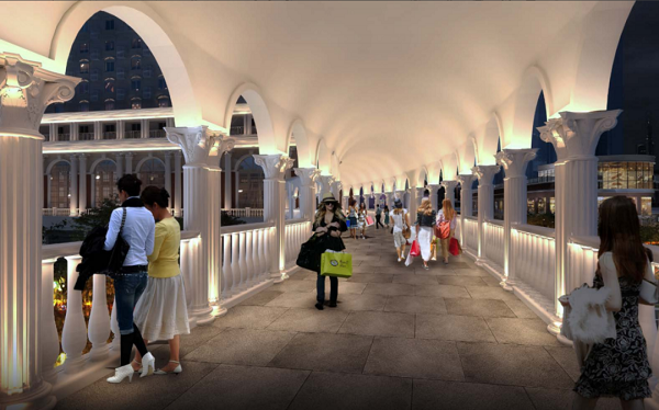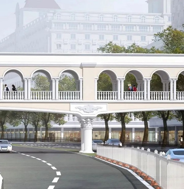 效果图。 闽江北岸全线贯通风情桥采用欧式廊桥样式,是为与相邻的中亭街利生苑欧式建筑风格相统一。天桥建成后将与不远处的闽江之心红砖青年桥遥相呼应,成为闽江之心又一道亮丽的景观。