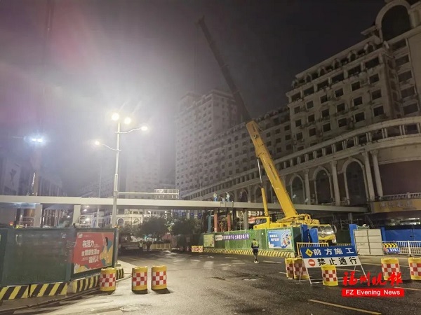 市城乡建总项目部负责人李翔介绍,风情桥施工现场位于城区中心主干道,桥梁施工紧邻两侧建筑,吊装环境复杂,交通压力大。通过与交警部门的沟通,吊装施工时段,现场采取封闭道路施工的方式,施工在深夜交通流量少的时段进行,并在次日6时恢复正常通行。
