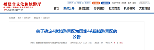 关于确定4家旅游景区为国家4A级旅游景区的公告 根据中华人民共和国国家标准《旅游景区质量等级的划分与评定》和《旅游景区质量等级管理办法》,经有关设区市旅游资源规划开发质量等级评定委员会推荐,福建省旅游资源规划开发质量等级评定委员会按程序组织综合评定并于2024年11月25日完成公示,确定以下4家旅游景区为国家4A级旅游景区。名单如下: 1.福州市闽侯县闽越水镇景区 2.三明市大田县桃源里景区 3.宁德市福鼎市牛郎岗景区 4.平潭综合实验区68海里景区 特此公告。 福建省旅游资源规划开发 质量等级评定委员会 2024年11月26日 |