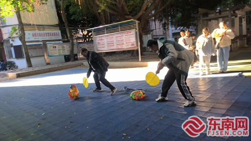 “赶鸡入笼”游戏。杨桥河南社区供图 在“赶鸡入笼”游戏中,根据学员们接受程度分为困难组和简单组,分别使用扇子和双手将“气球公鸡”赶入终点区域,有效锻炼了他们的体力和耐心。而“光盘拔河”环节,学员们手持彩虹圈两端,通过摇动摇圈使光盘滑动,锻炼身体协调性。