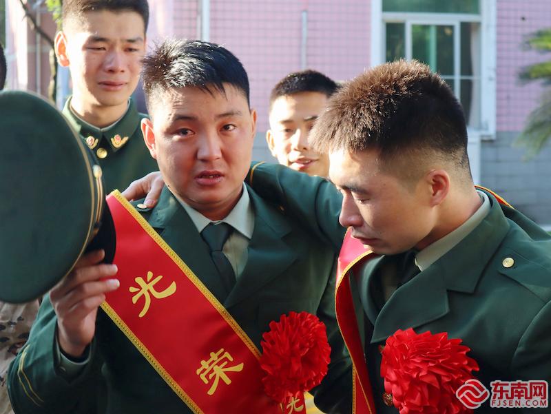 武警福建总队福州支队退伍老兵泪别战友。胡烯鹏 摄